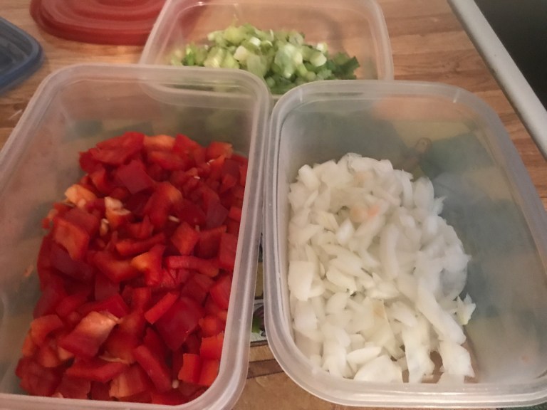 Dice the vegetables (spring onion, red bell pepper, 1/2 white onion)