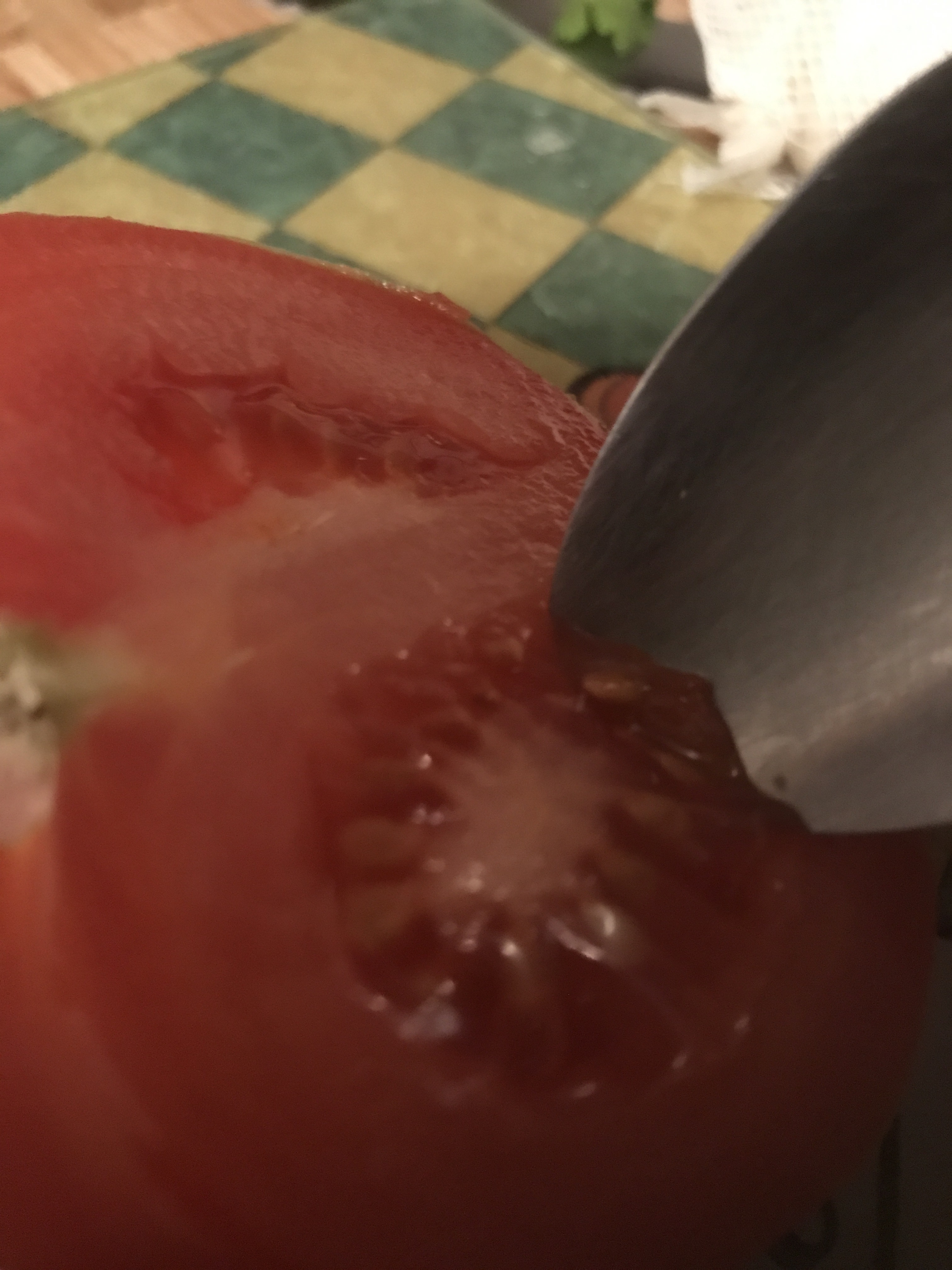 Cut 3 Tomatoes in half and remove the seeds by scooping them out with a spoon.