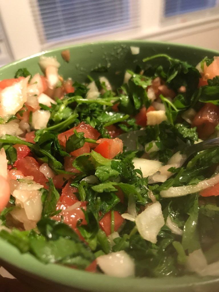 Dice the tomatoes along with the white onions. Chop cilantro. Mix together in a bowl and set aside.