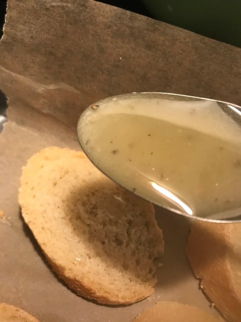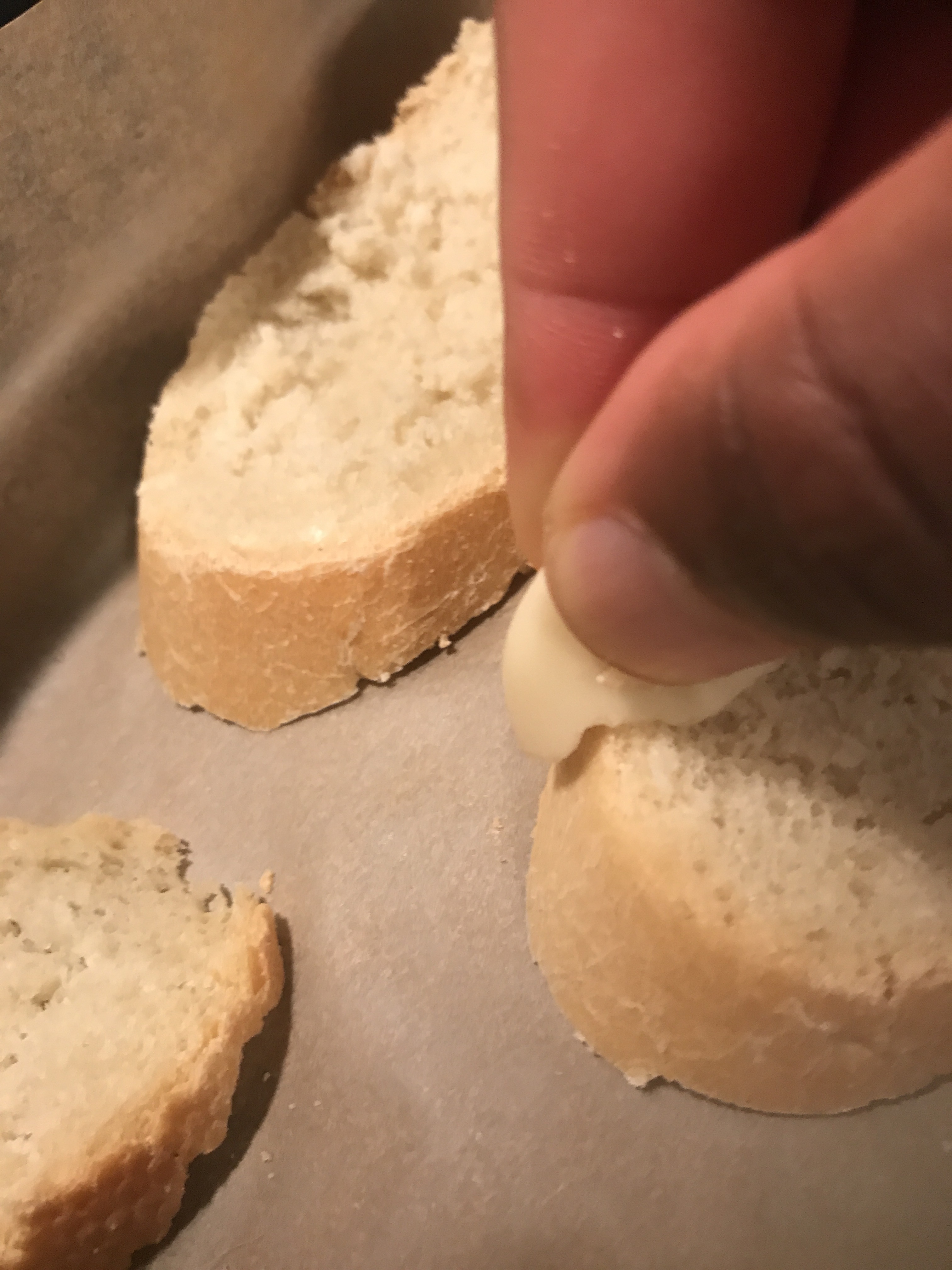 Place the baguette slices with the olive oil mixture onto a baking sheet (spread the slices evenly, make sure they aren’t touching) and put them in the oven for 10 minutes on 350 degrees. (until Golden brown)