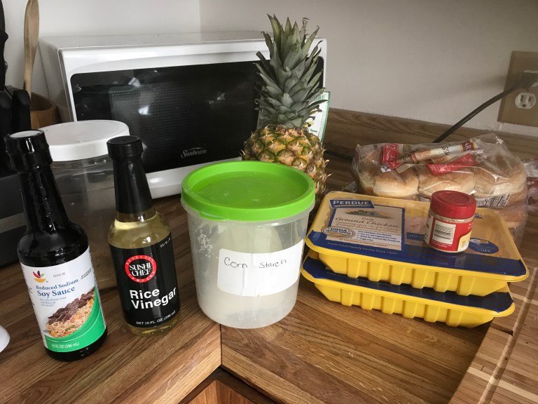 Next you are going to start with the burger. Put the ground chicken in bowl and break it up using a fork. Pour the Teriyaki sauce on the ground chicken and mix around until evenly coated. Mix in bread crumbs so the patties can bind together, making it easier to form patty sliders.