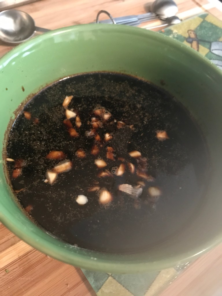 The first thing you would want to make would be the Teriyaki Sauce. Do this by combining the ginger, soy sauce, rice wine vinegar, garlic cloves (chopped) and brown sugar in a bowl.