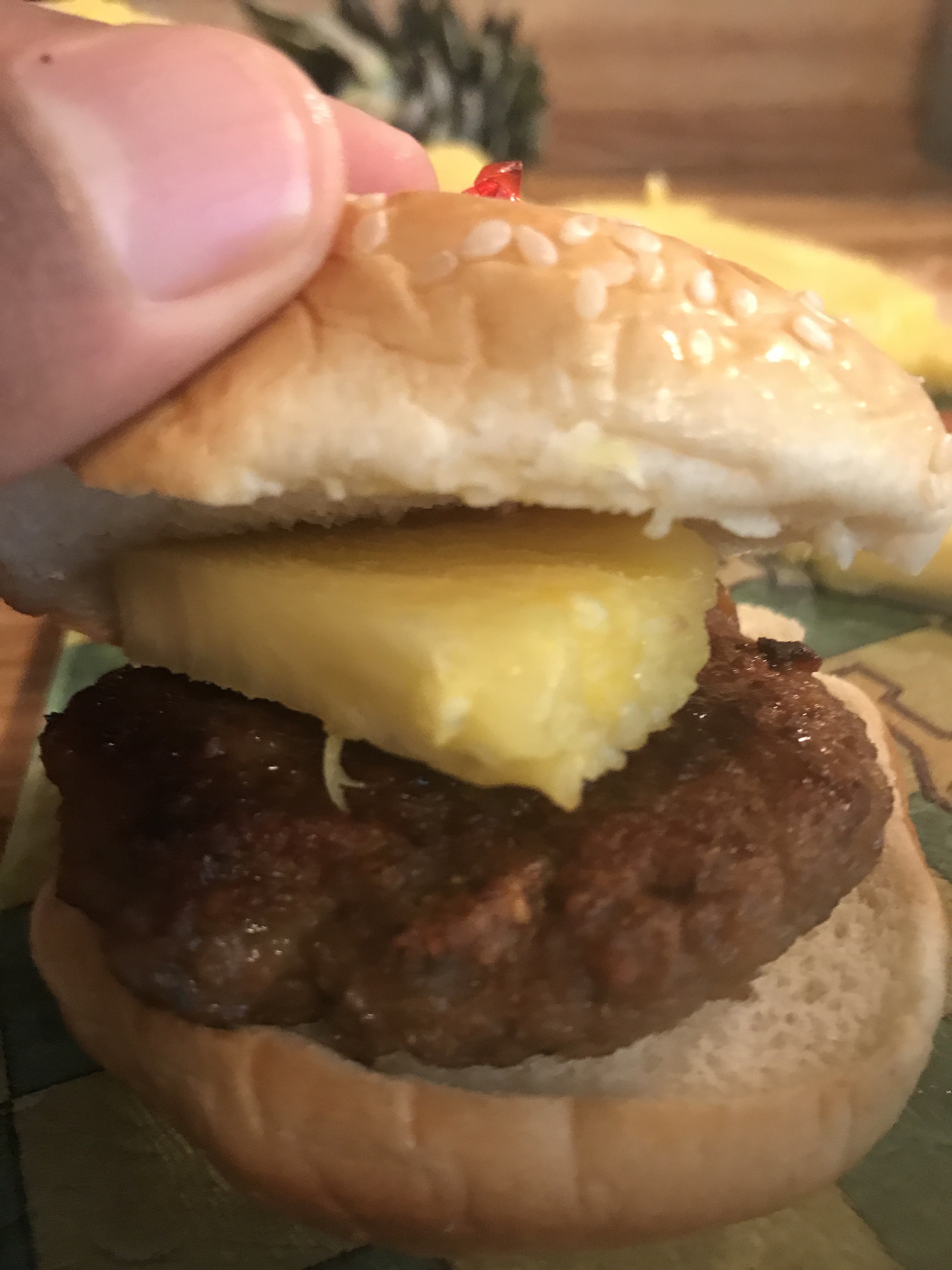 Cut the pineapple into slices then cut the slices into 4ths. Place 1/4 pineapple on top of the burger in between the slider buns. Stick a tooth pick in-between to keep them in place.