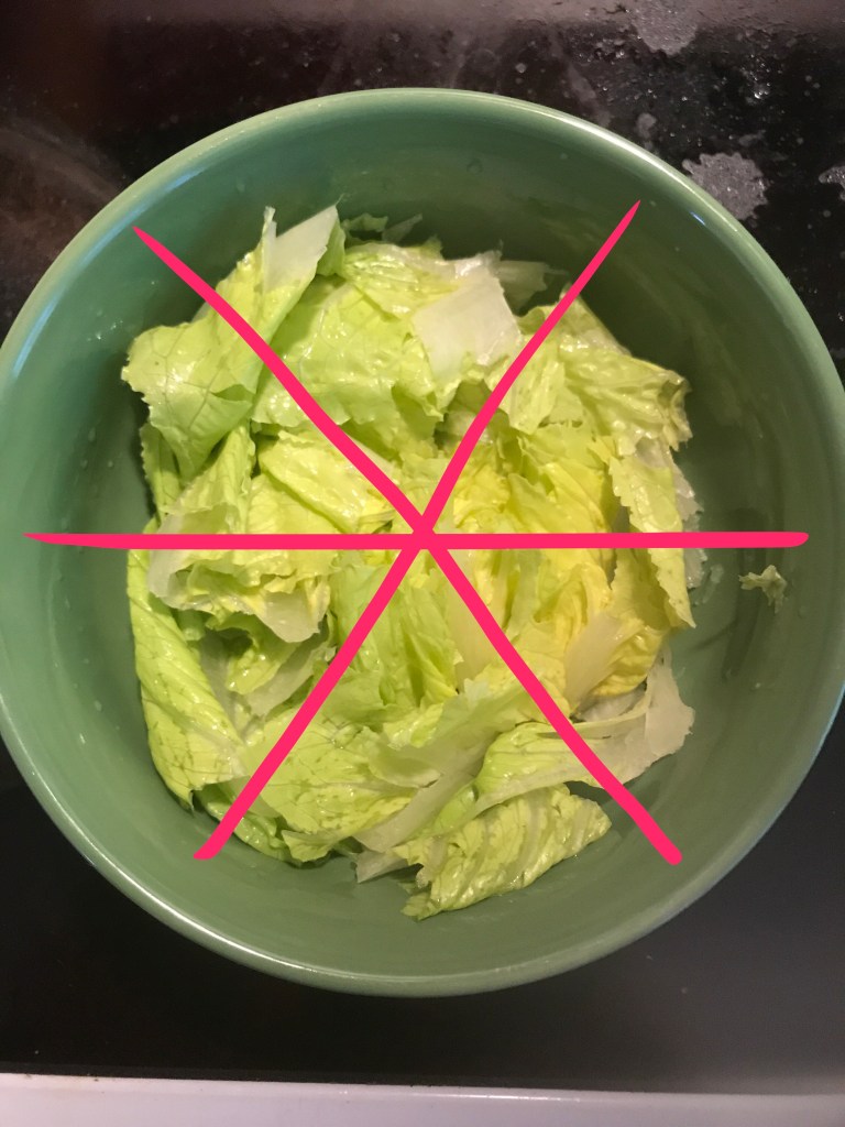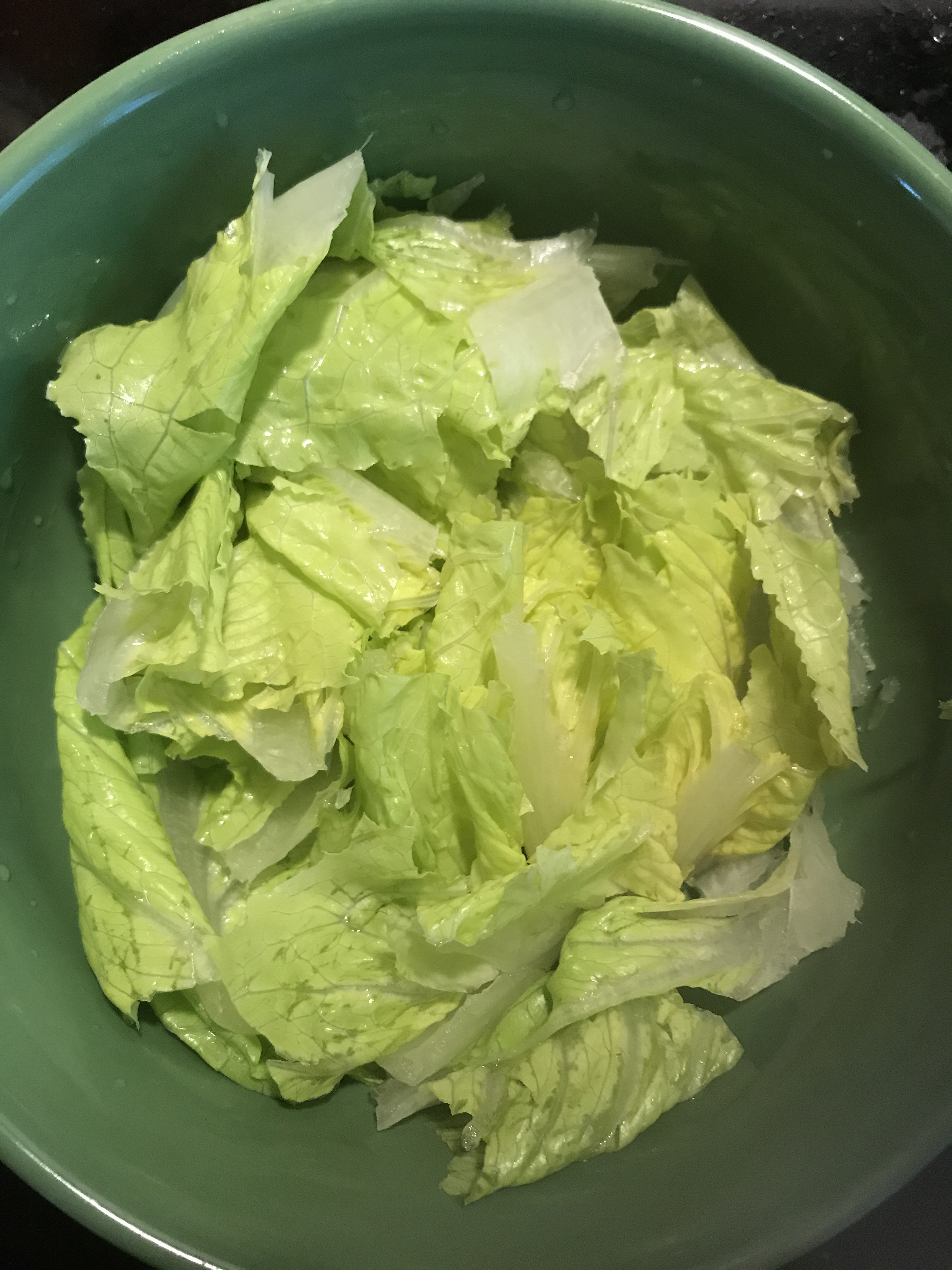 Start the salad with a bowl. Line the bottom with chopped washed romaine lettuce.