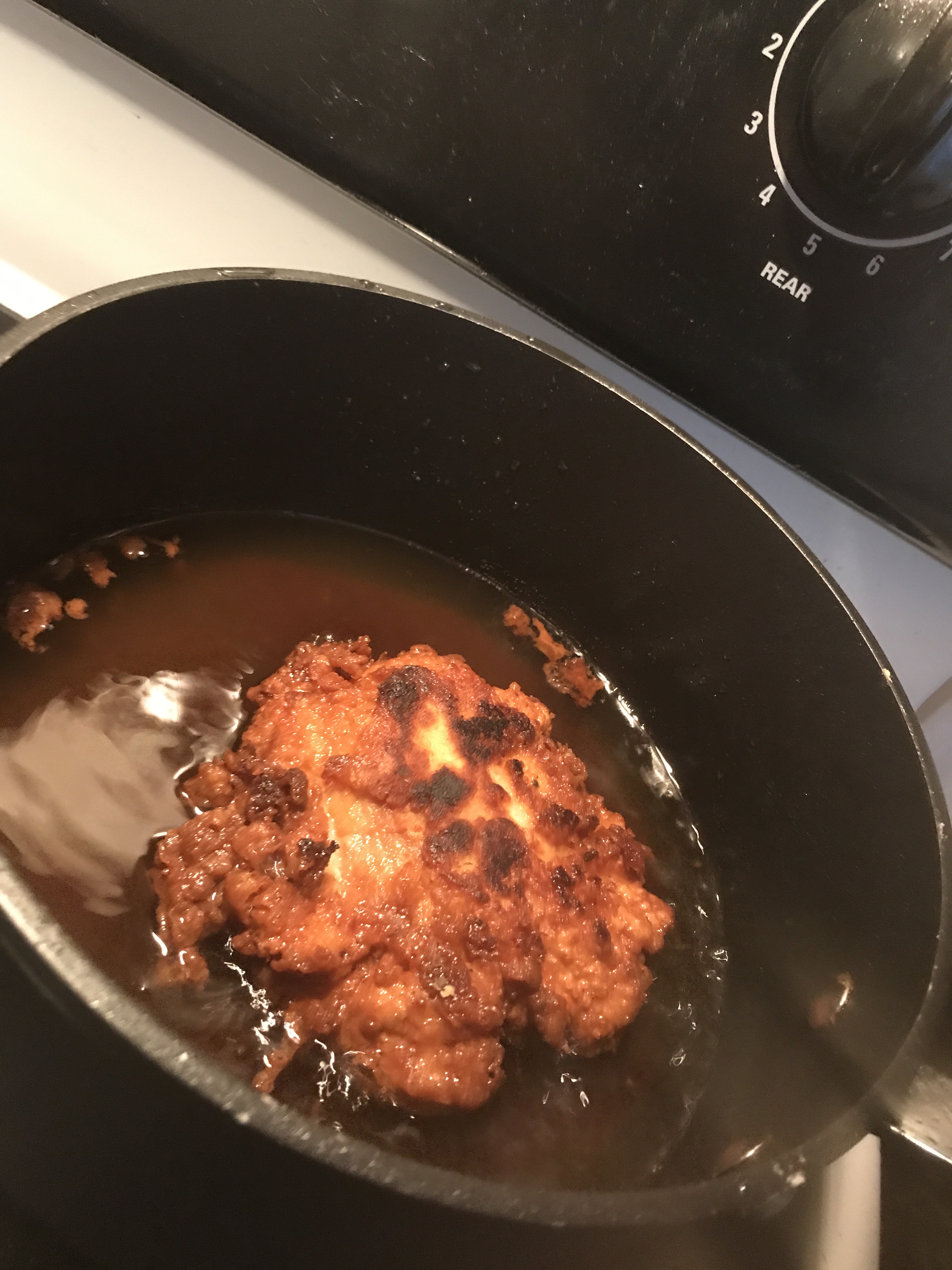 Season the chicken thigh with Salt, and pepper. Beat two eggs and coat them in the chicken breast. Coat the chicken in Flour, then back to the eggs, then once again the flour. Put the coated chicken in a pot filled with vegetable oil on high. Make sure chicken is cooked through.