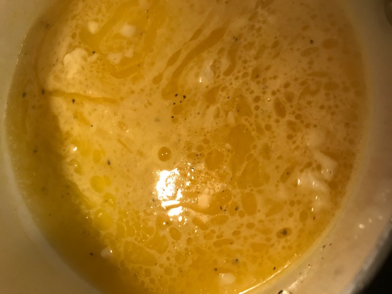 In separate frying pan turn the heat to medium. Add half a cup of honey, orange zest, half a cup of orange juice, half a cup of rice wine vinegar, 2 tbsp of Sriracha, 1 tbsp of ginger, 3 tbsp of soy sauce, juice of half a lemon and 2 tsp of Sesame Oil. heat on medium.