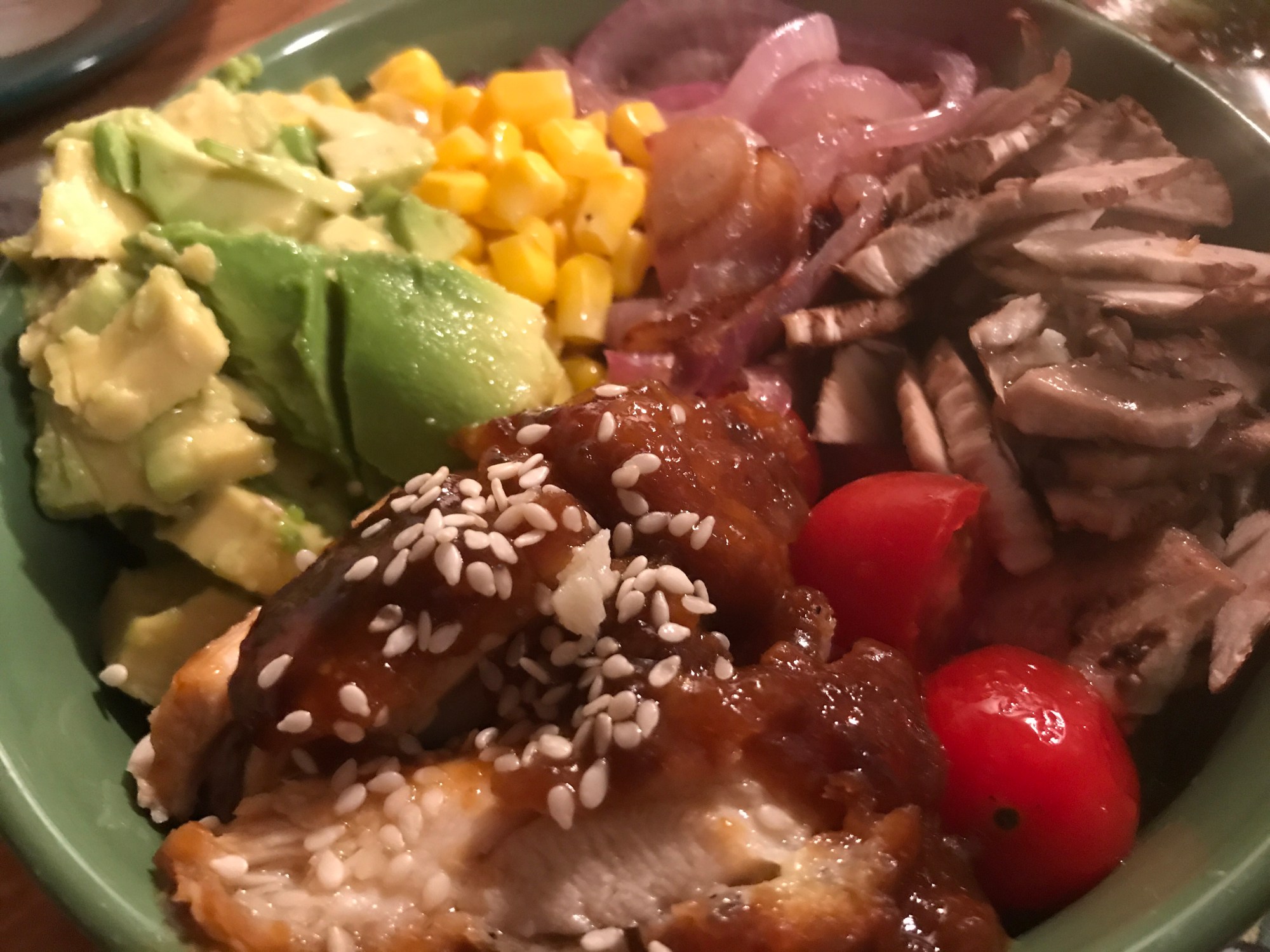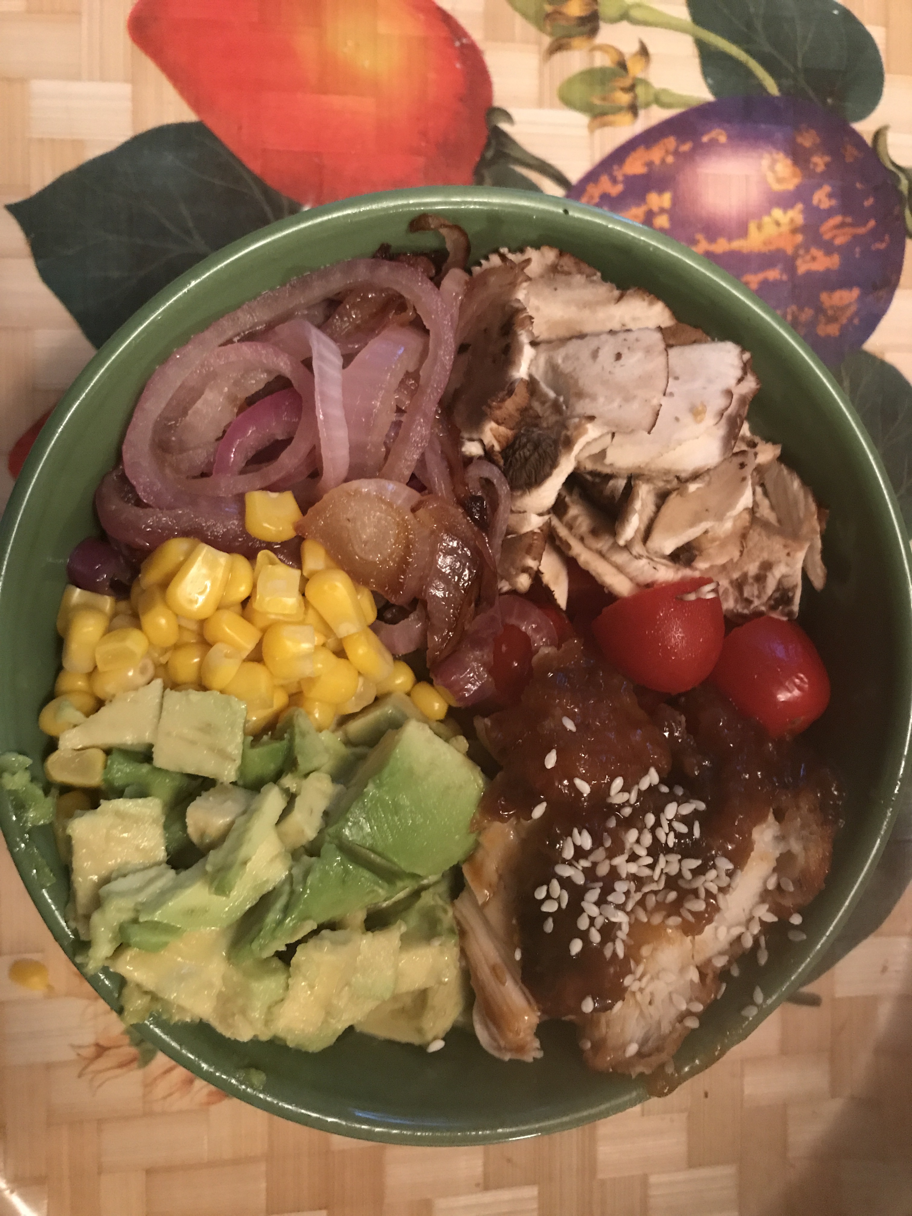Sprinkle with Sesame Seeds and cut lengthwise. Add the chicken to the sixth and final part of the bowl. Take the vinaigrette out of the fridge and add to the salad bowl.