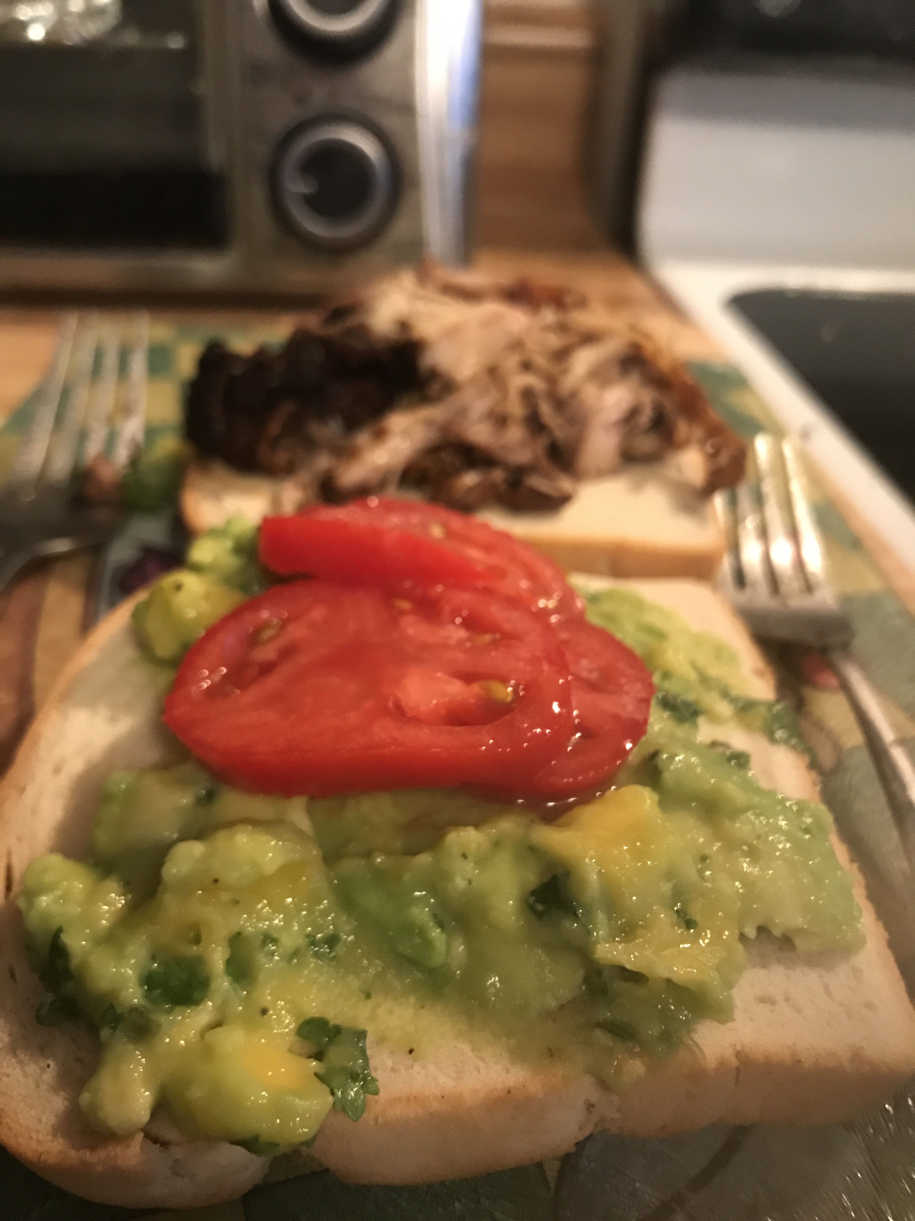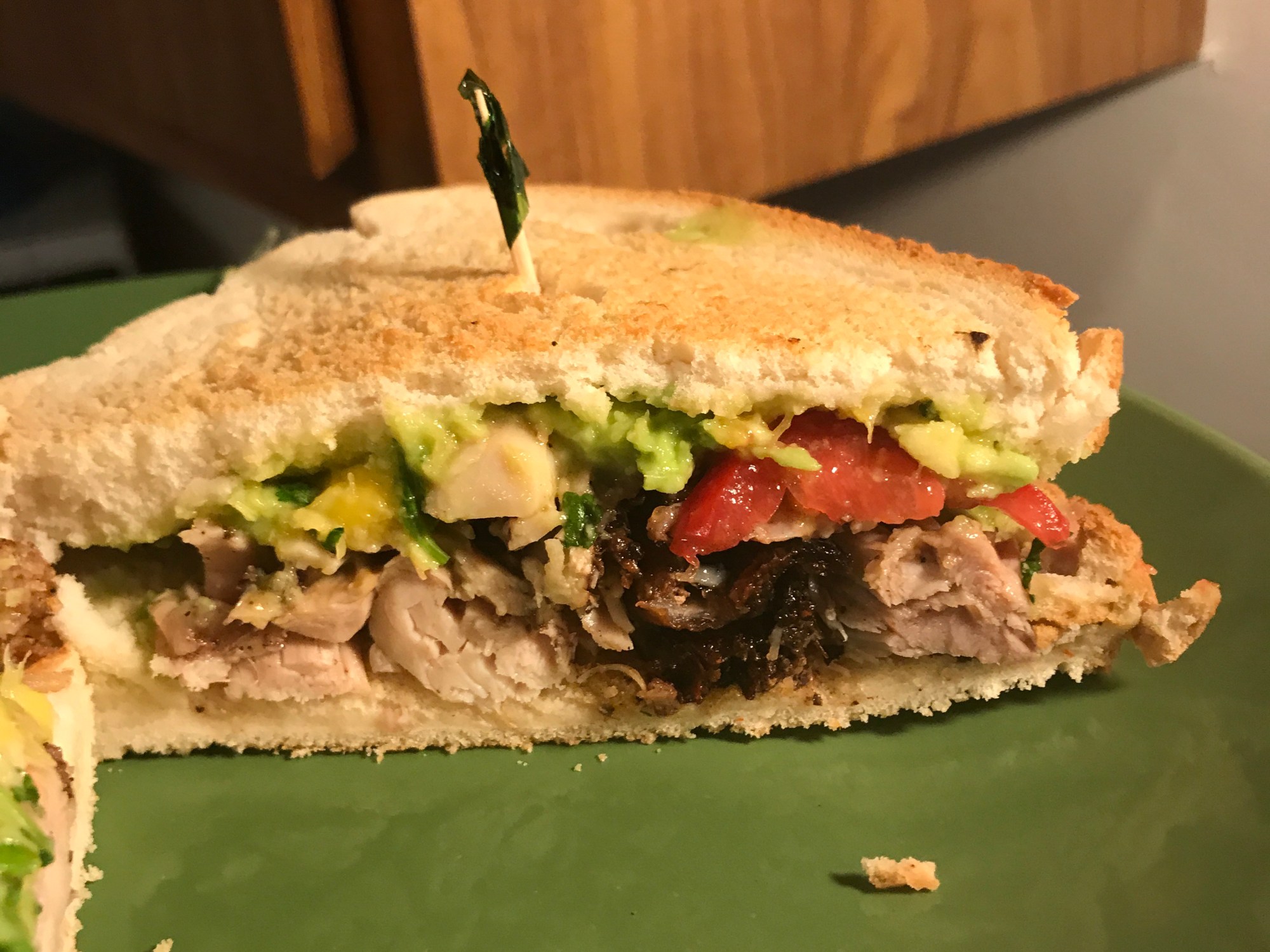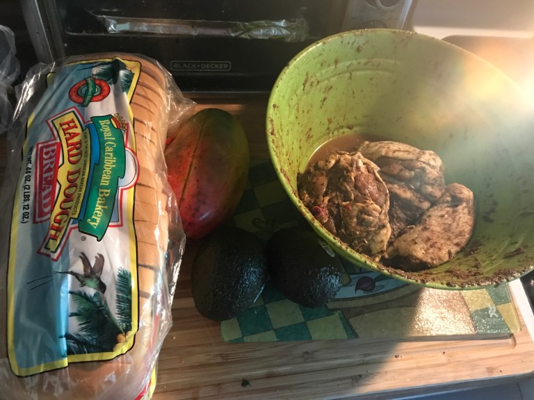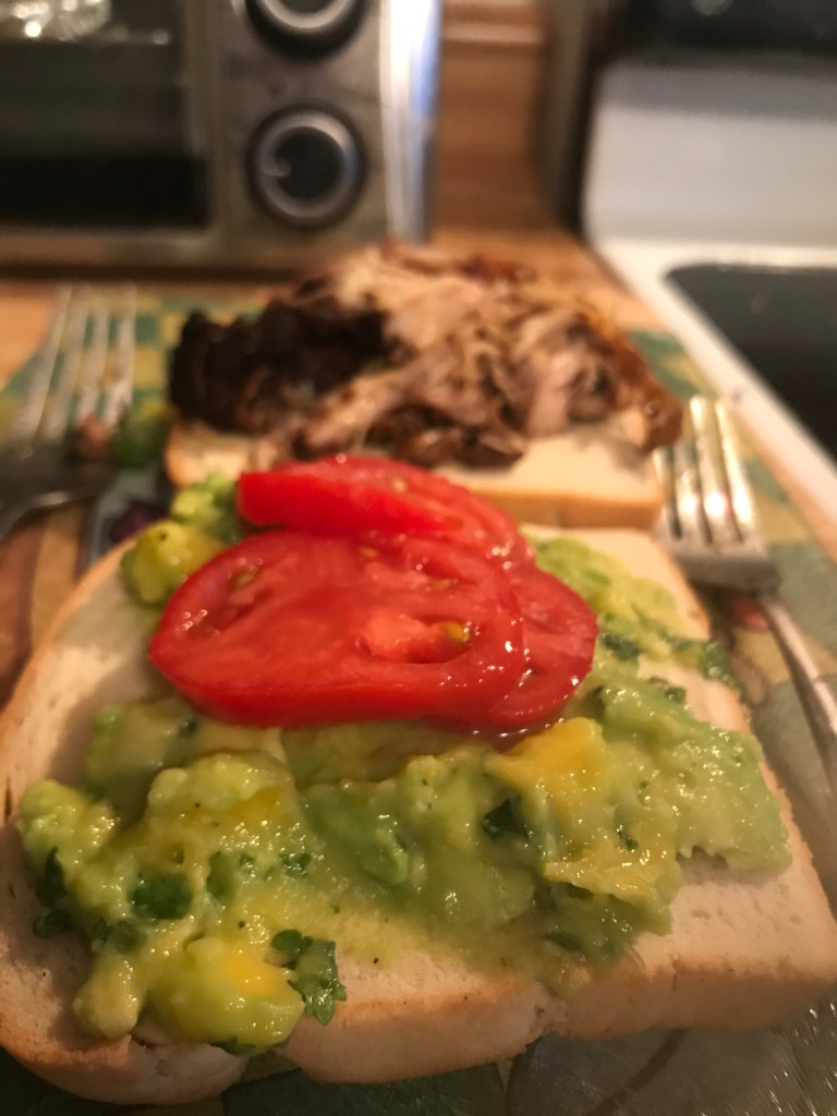 Set the pulled jerk chicken on one of the slices of bread and the avocado mango spread on the other slice. Add 2 slices of tomatoes to the avocado mango spread.