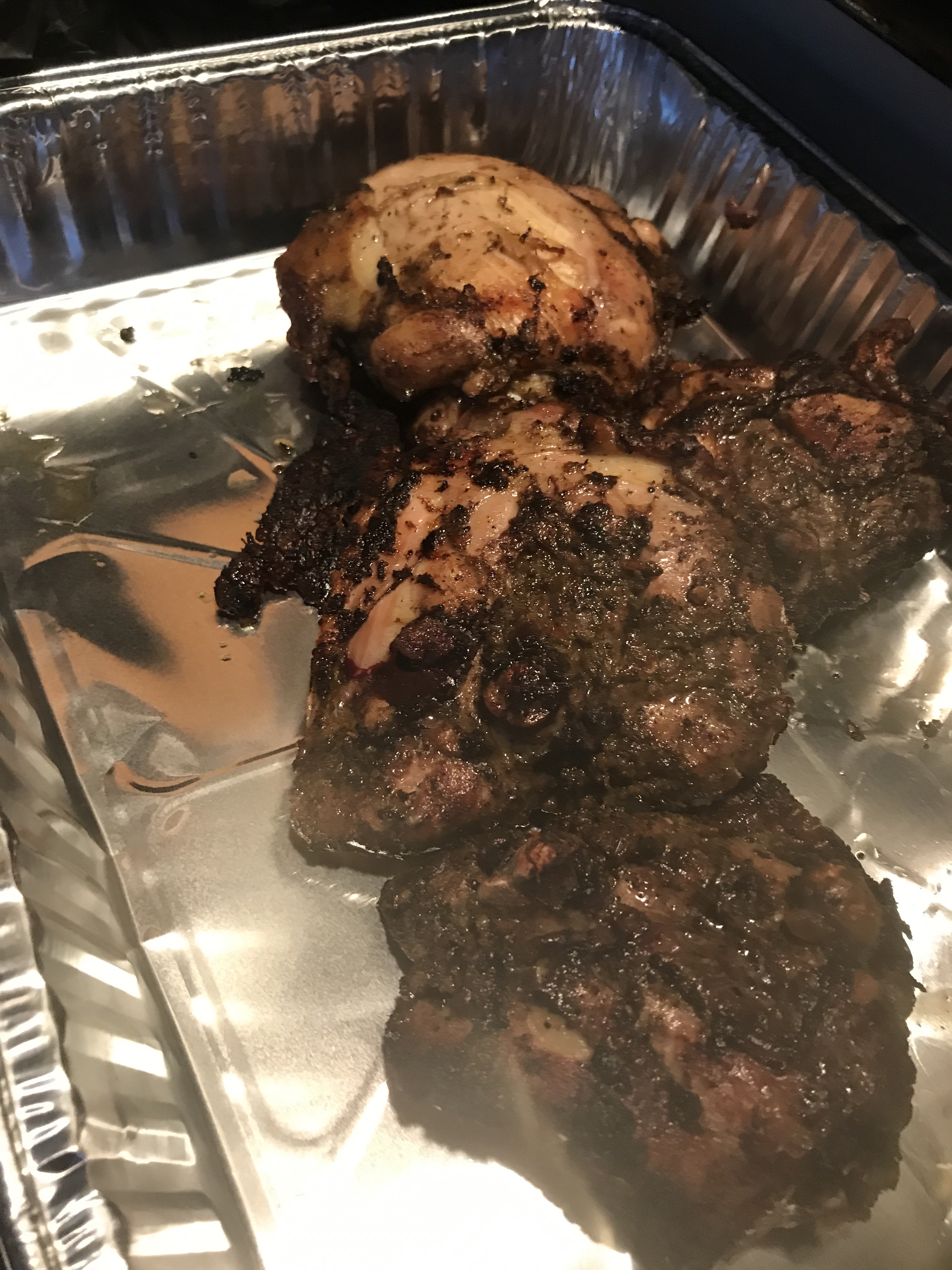 Marinate chicken thighs in jerk Marinade for 2 hours in a sealed bowl in refrigerator. Once the time is up, cook the chicken either on the grill or in the oven for about an hour and a half at about 400 degrees.