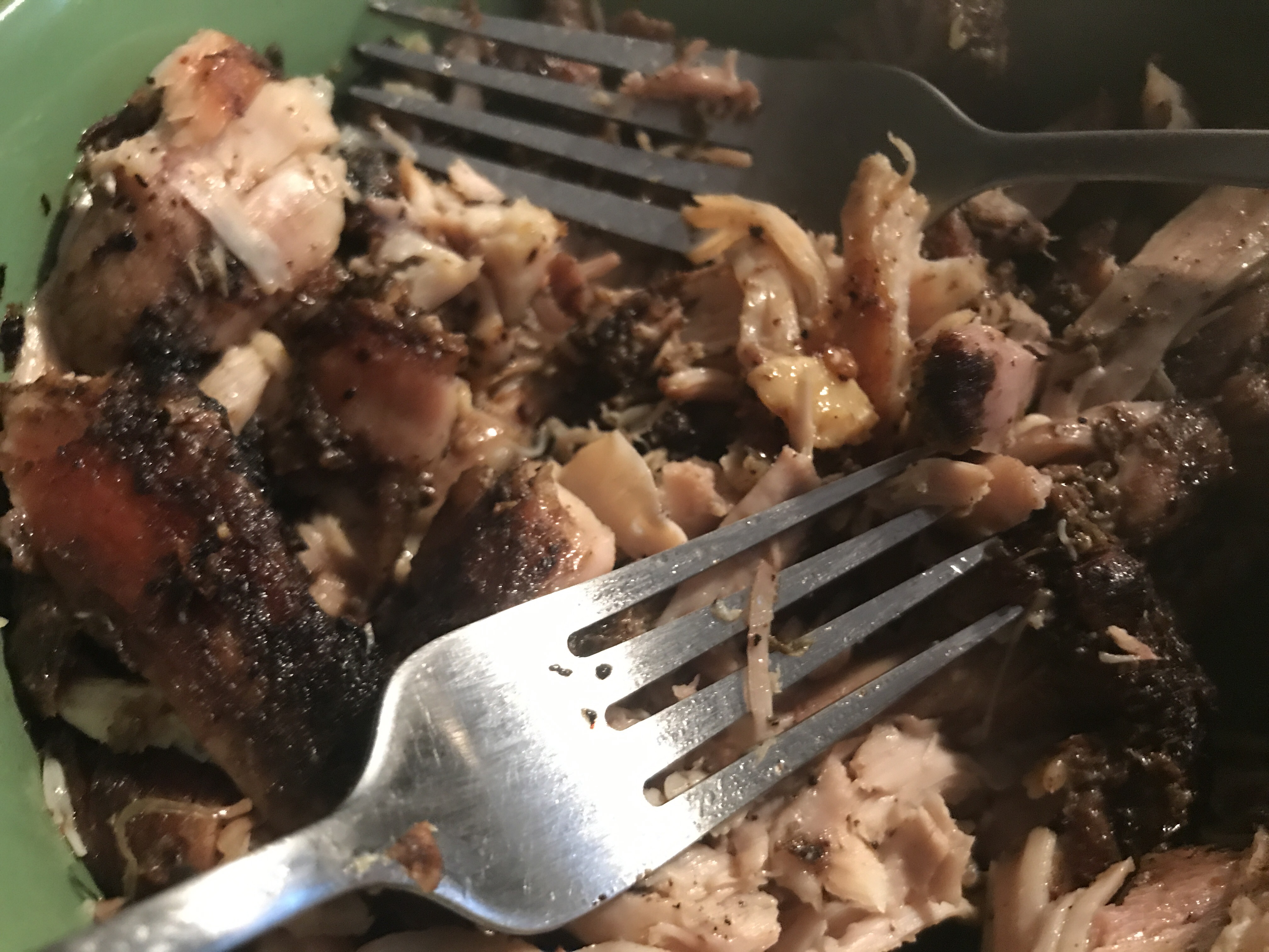 Once the chicken is finished pull apart the jerk chicken using two forks and set aside in a bowl.