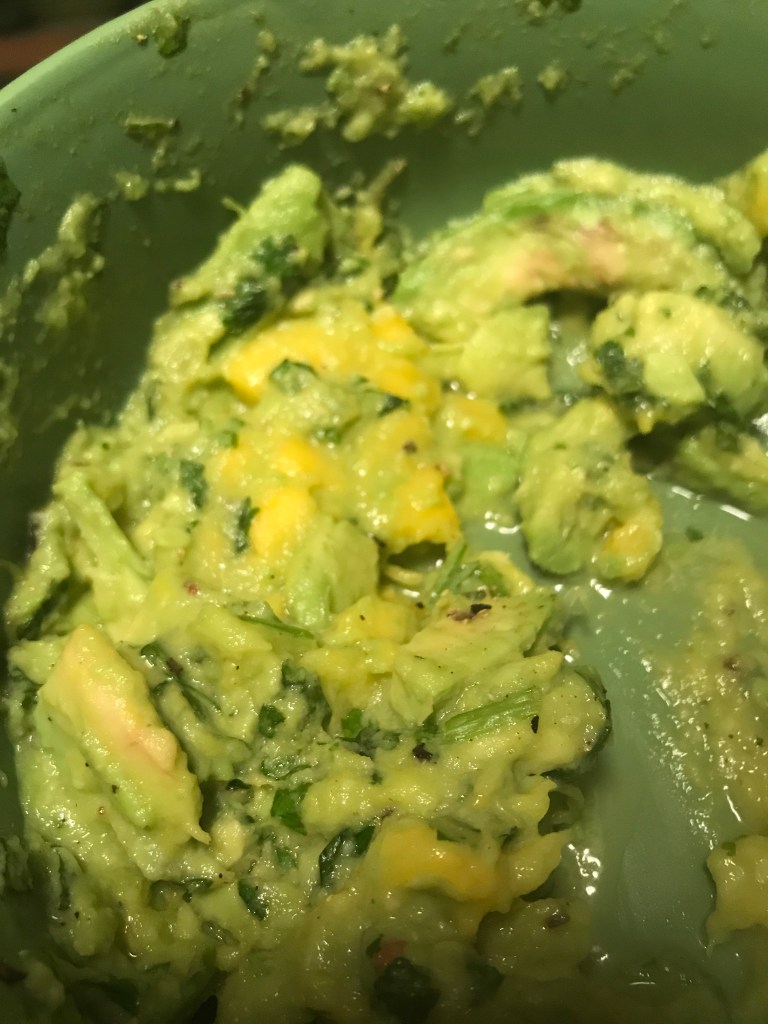 Make the Avocado Mango spread by making guacamole and mixing in diced mangoes. Cut two avocados into slices, chop one bunch of cilantro, use the juice of two limes, and season with salt and black pepper. Mix together until a spread is made.