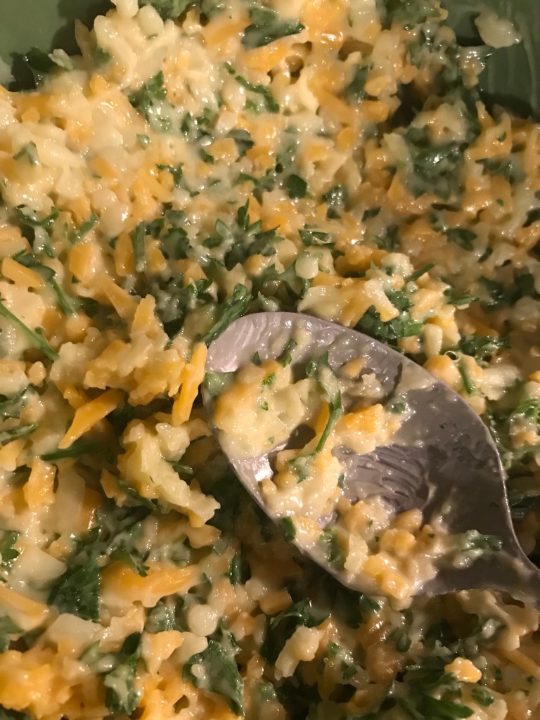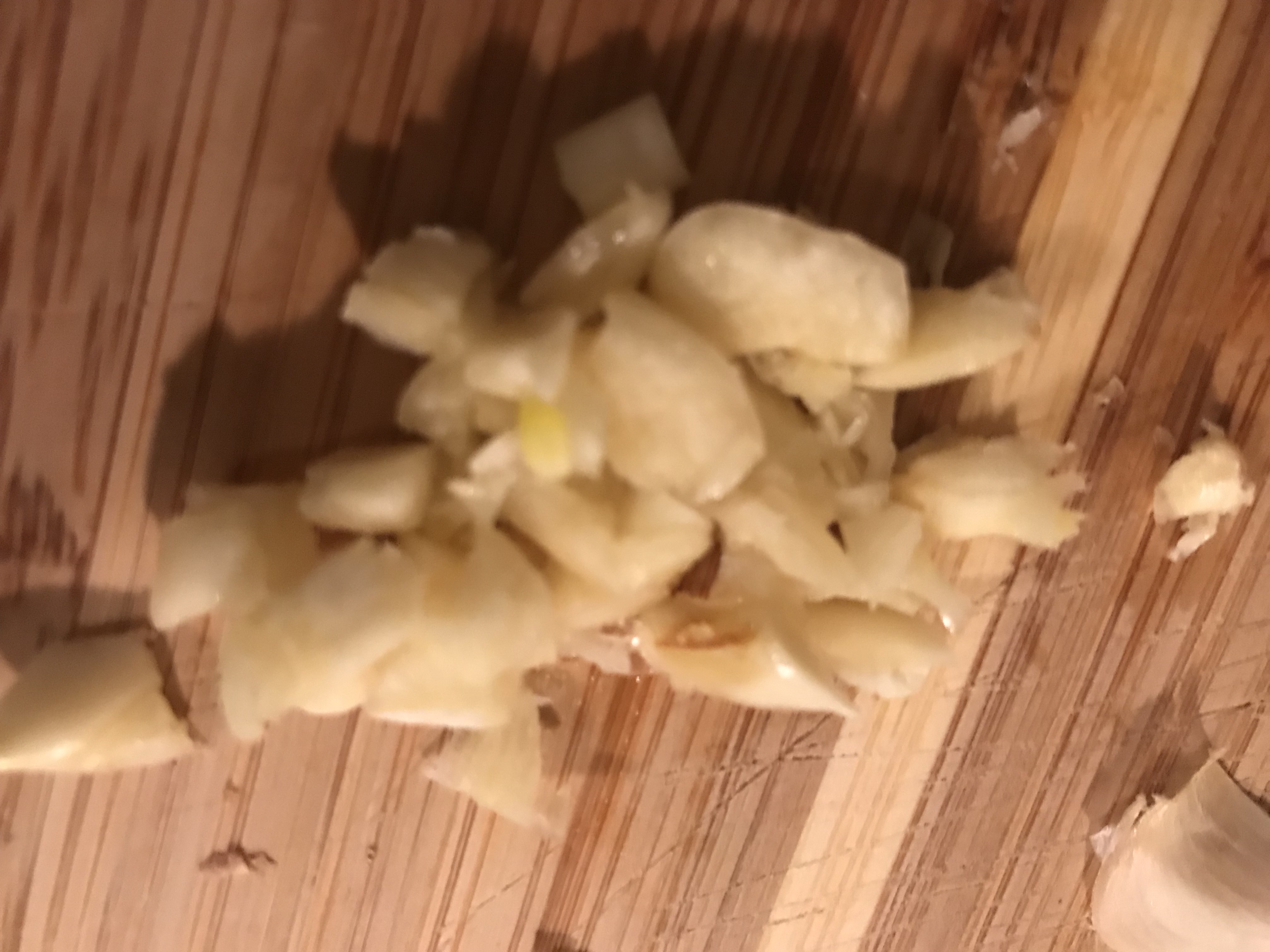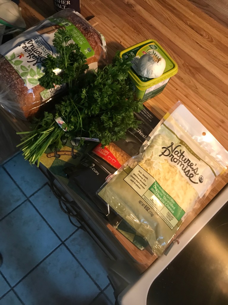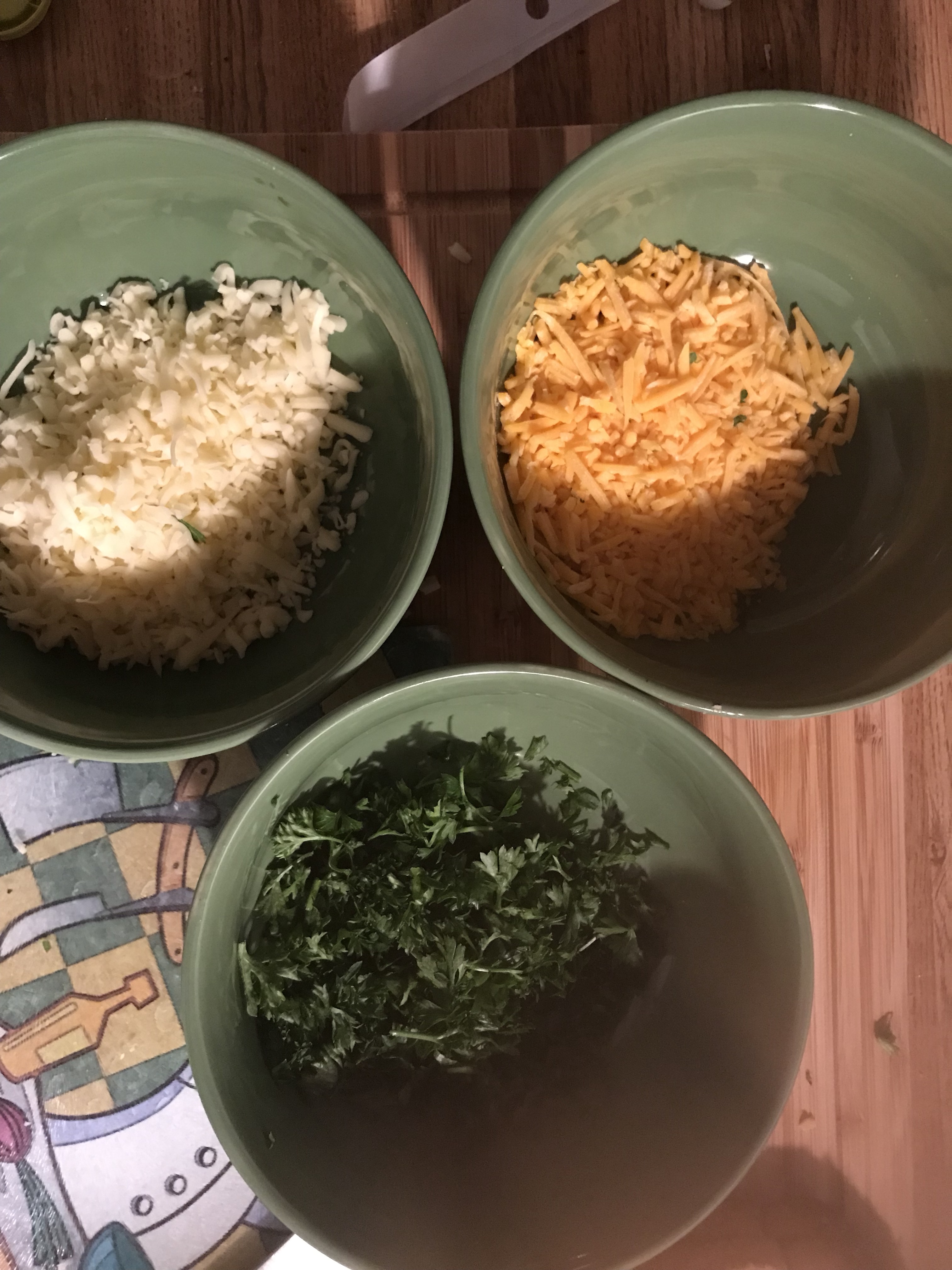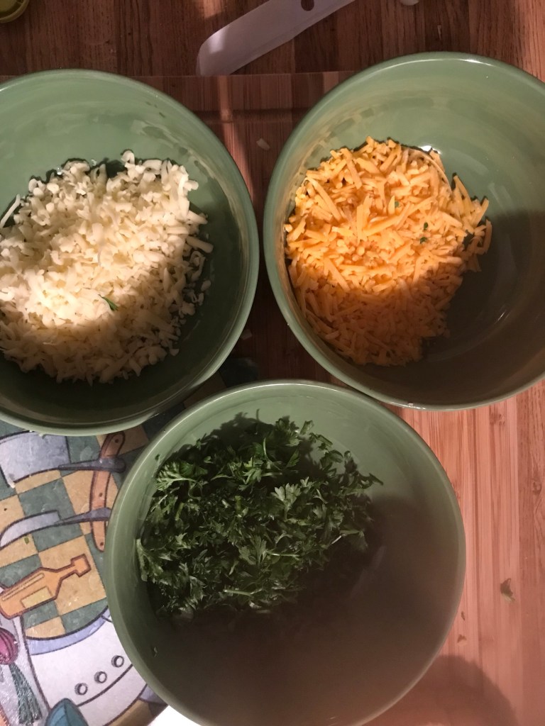 First, chop the parsley into small pieces.  Take the shredded mozzarella and cheddar, and  dice it into even smaller pieces.  Chop 3 gloves of garlic.