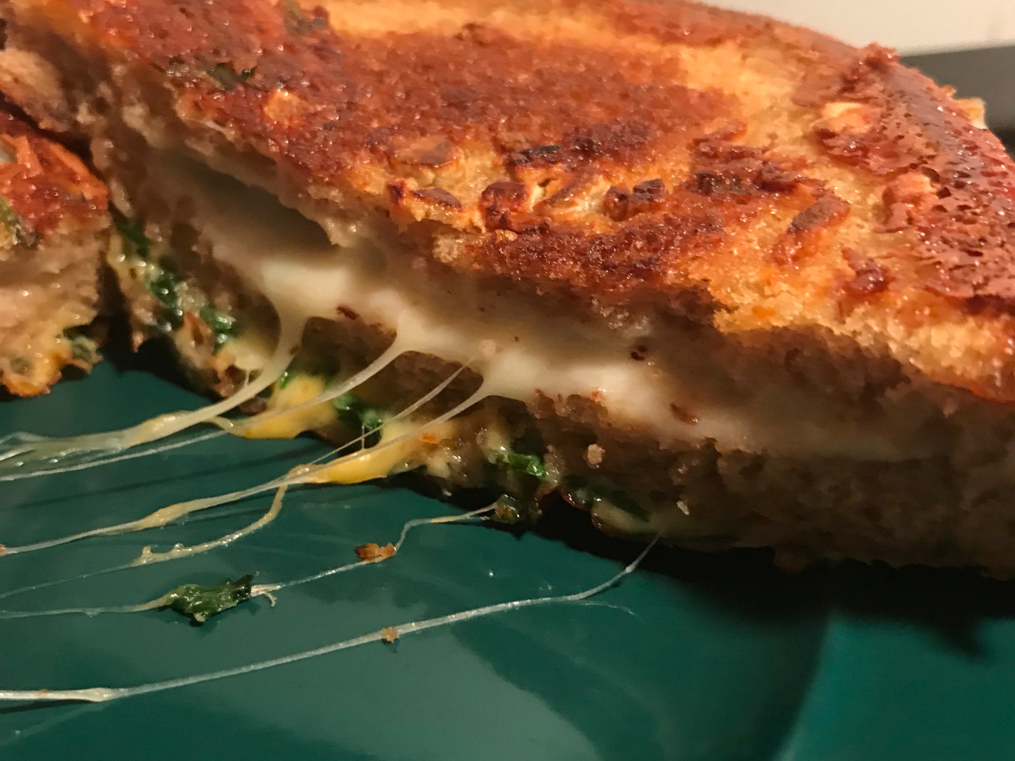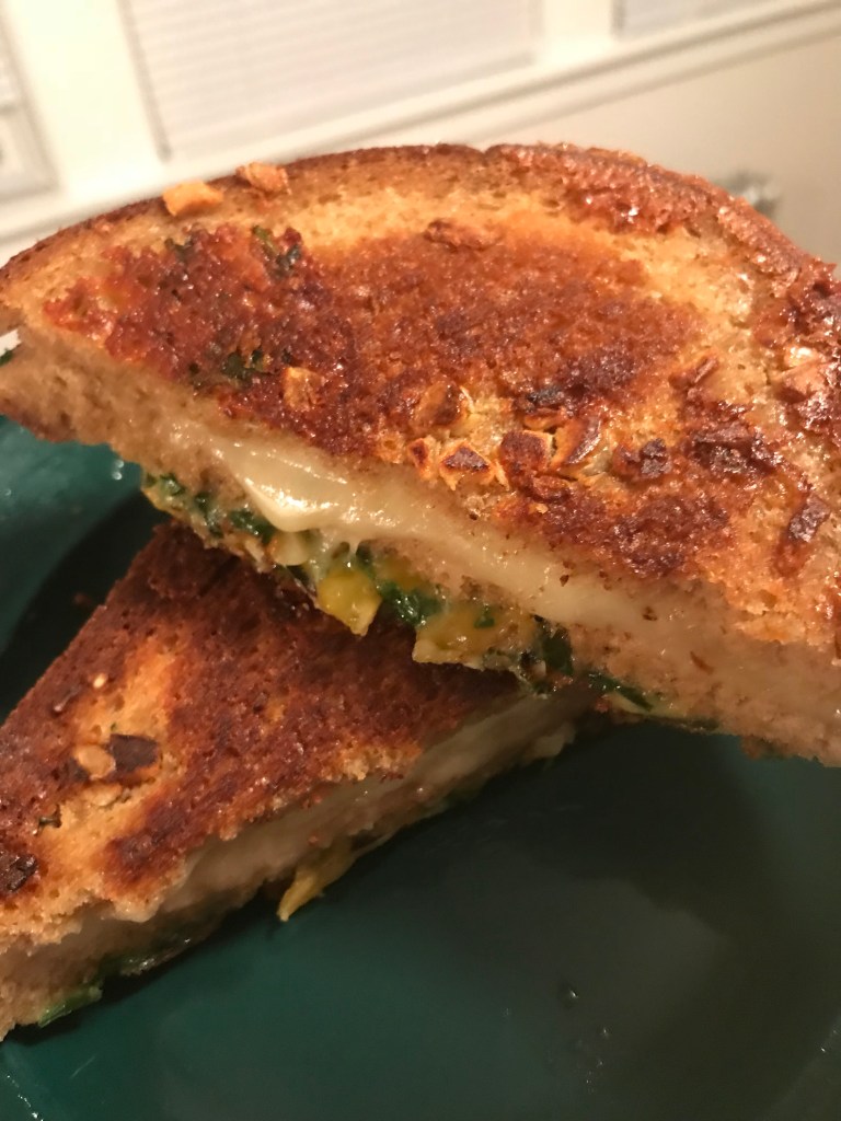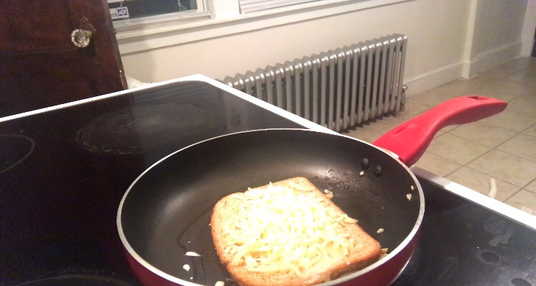 Turn the frying pan to medium and put one slice on the frying pan (spread side down) put the other slice on top (spread side up).  Have the sandwich fry for about 3 minutes then flip.