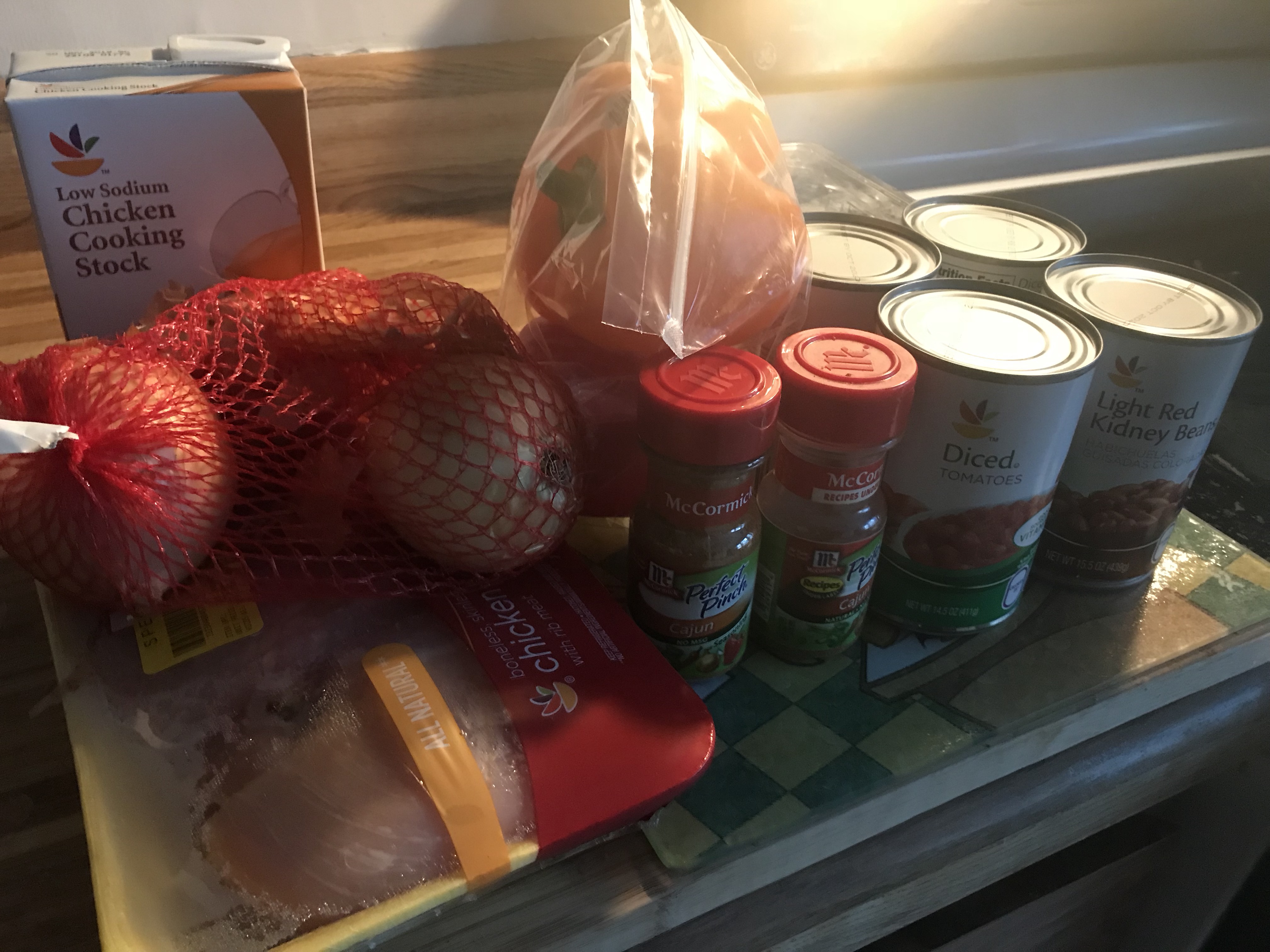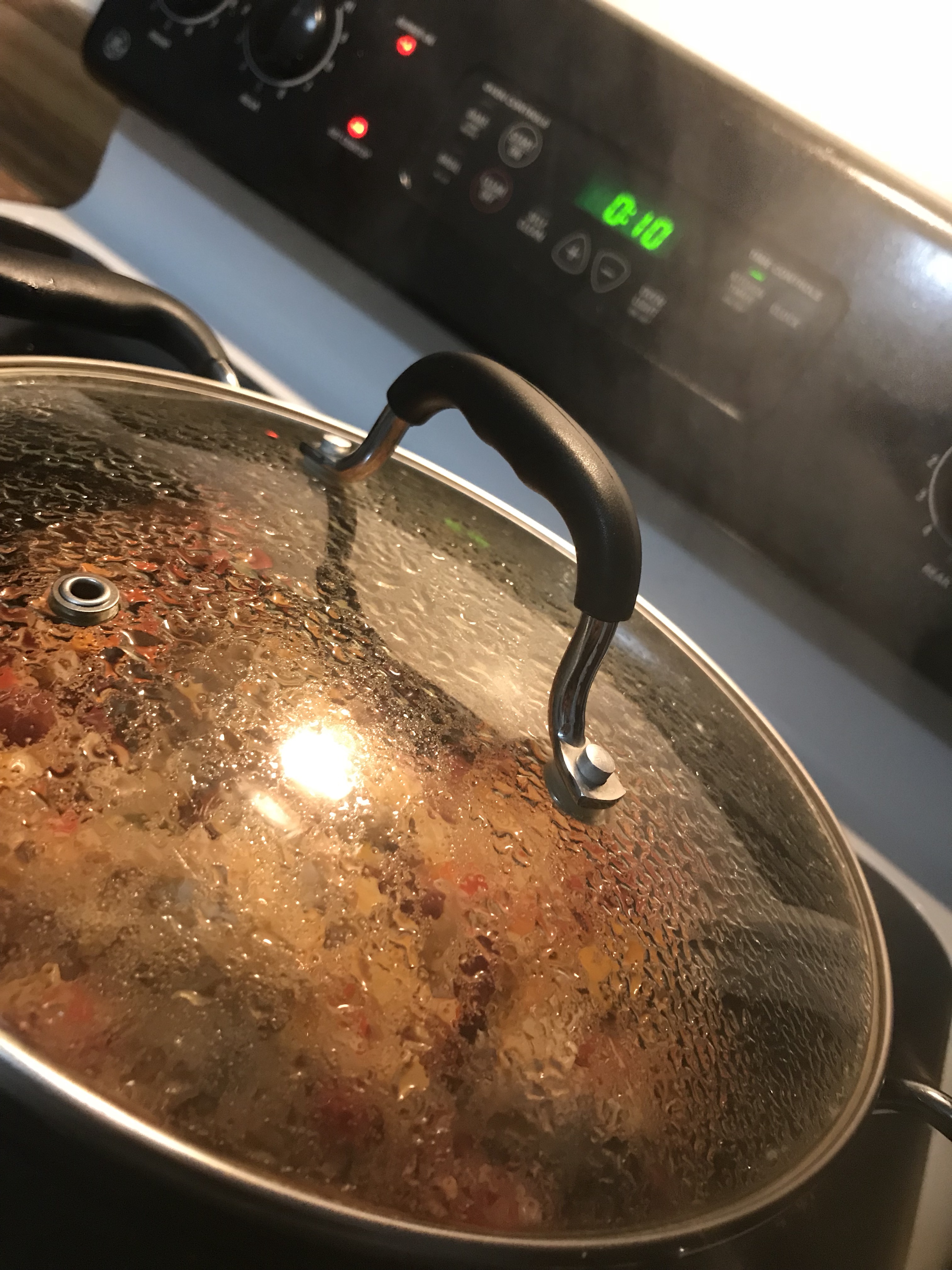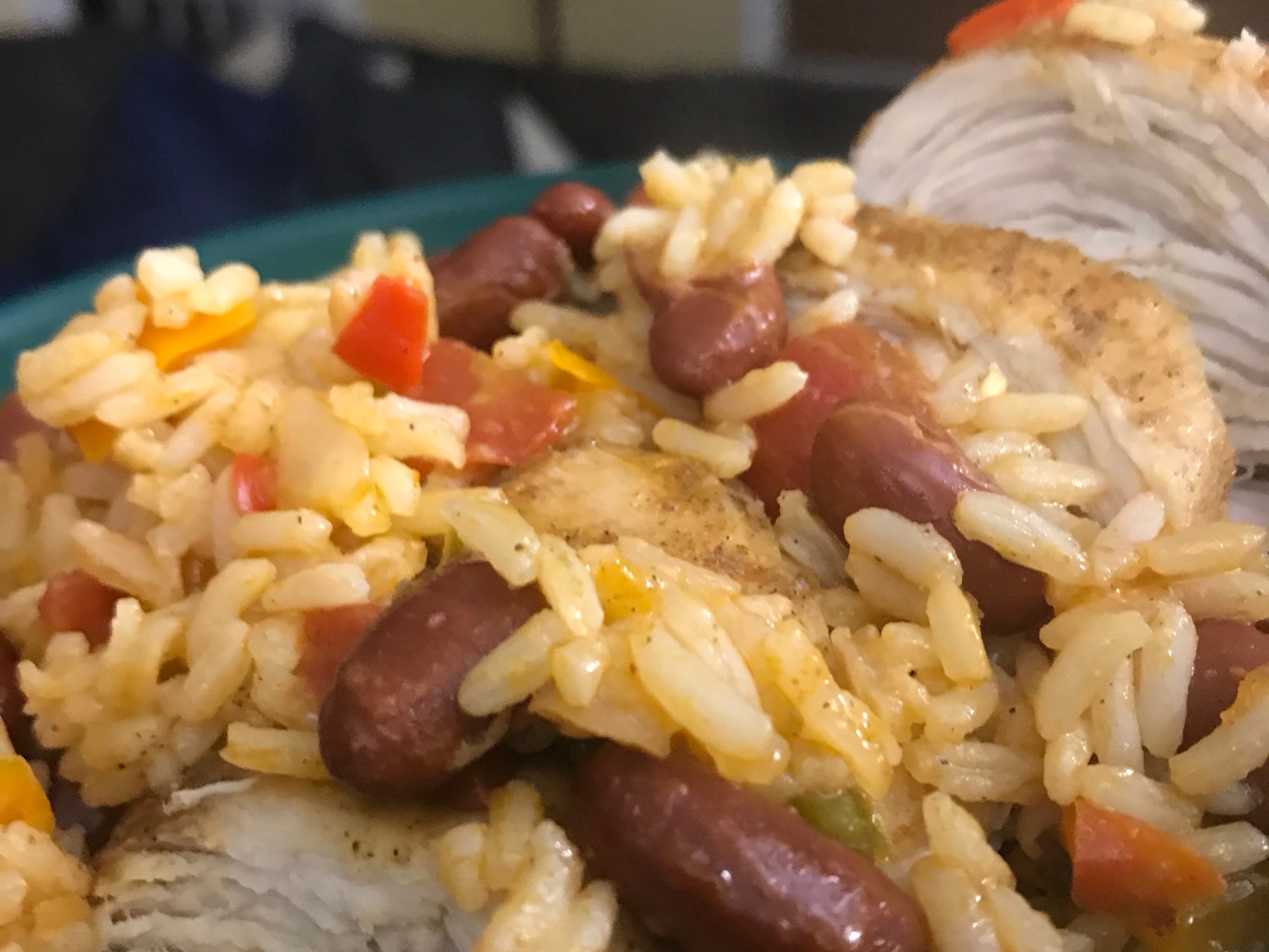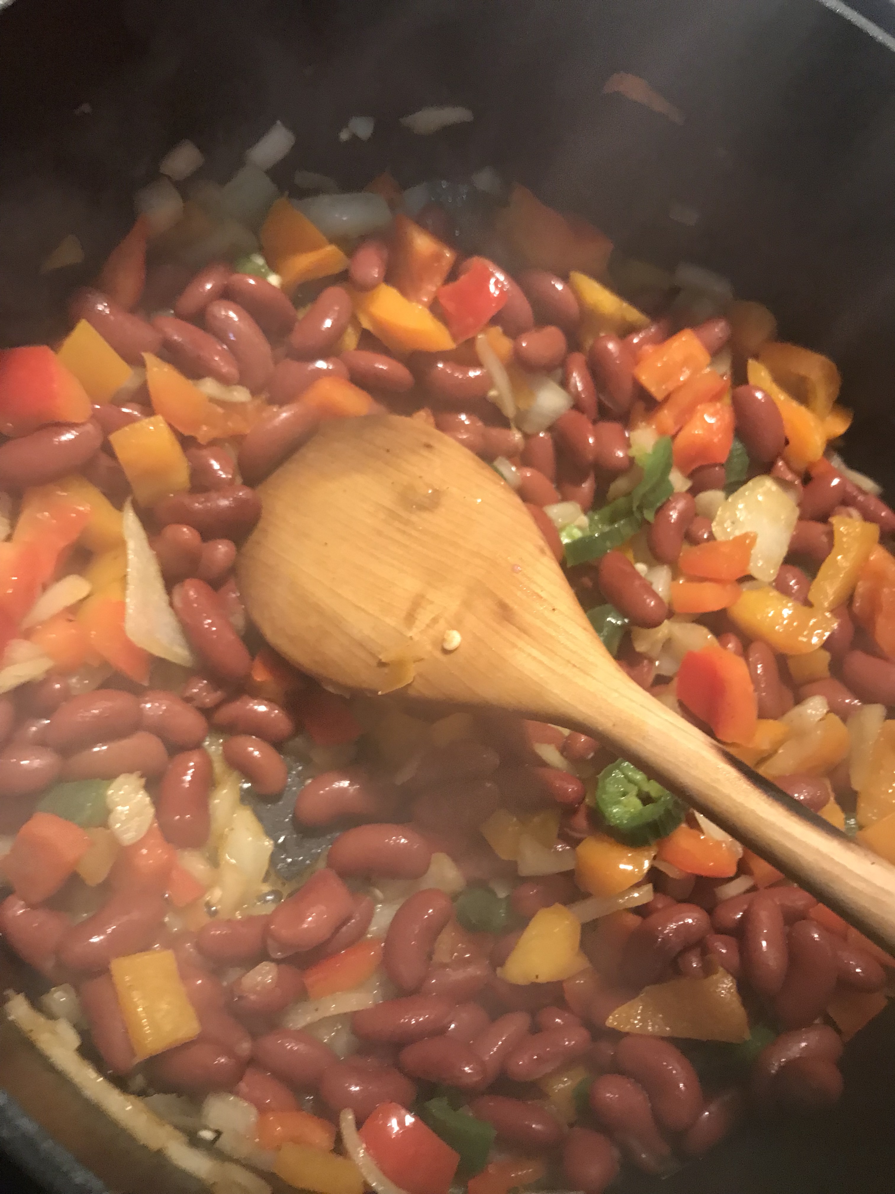 add vegetable oil and 1 cup of mixed peppers, 1 cup of drained red kidney beans, and 1 cup of dry white rice.