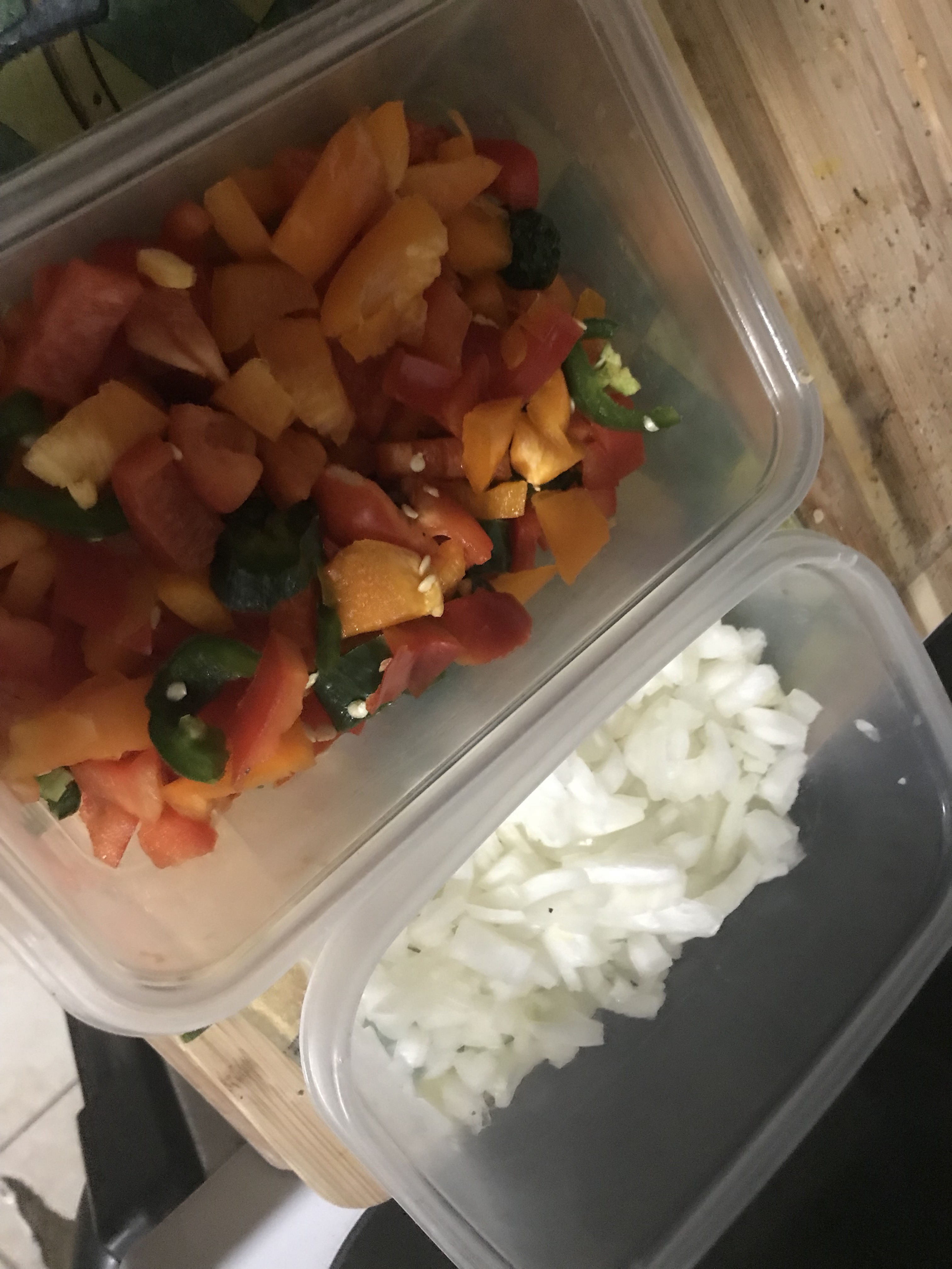 Dice the onion and mixed bell peppers to make around 1 cup of diced peppers.