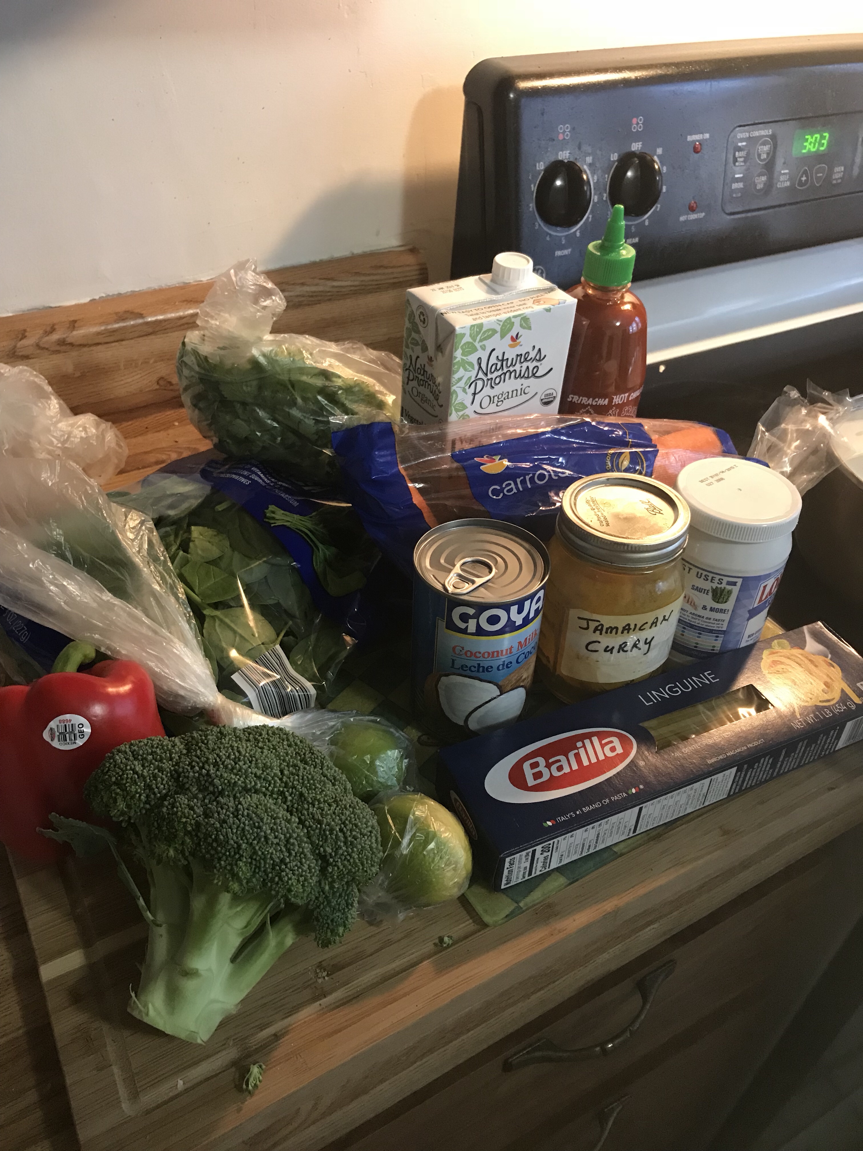 Add the 4 cloves of garlic, the ginger and curry powder with soy sauce. Stir contents until the smell hits you (should be no more then a minute) and then add the coconut milk and vegetable broth. Be sure to stir regularly while bringing to a simmer.