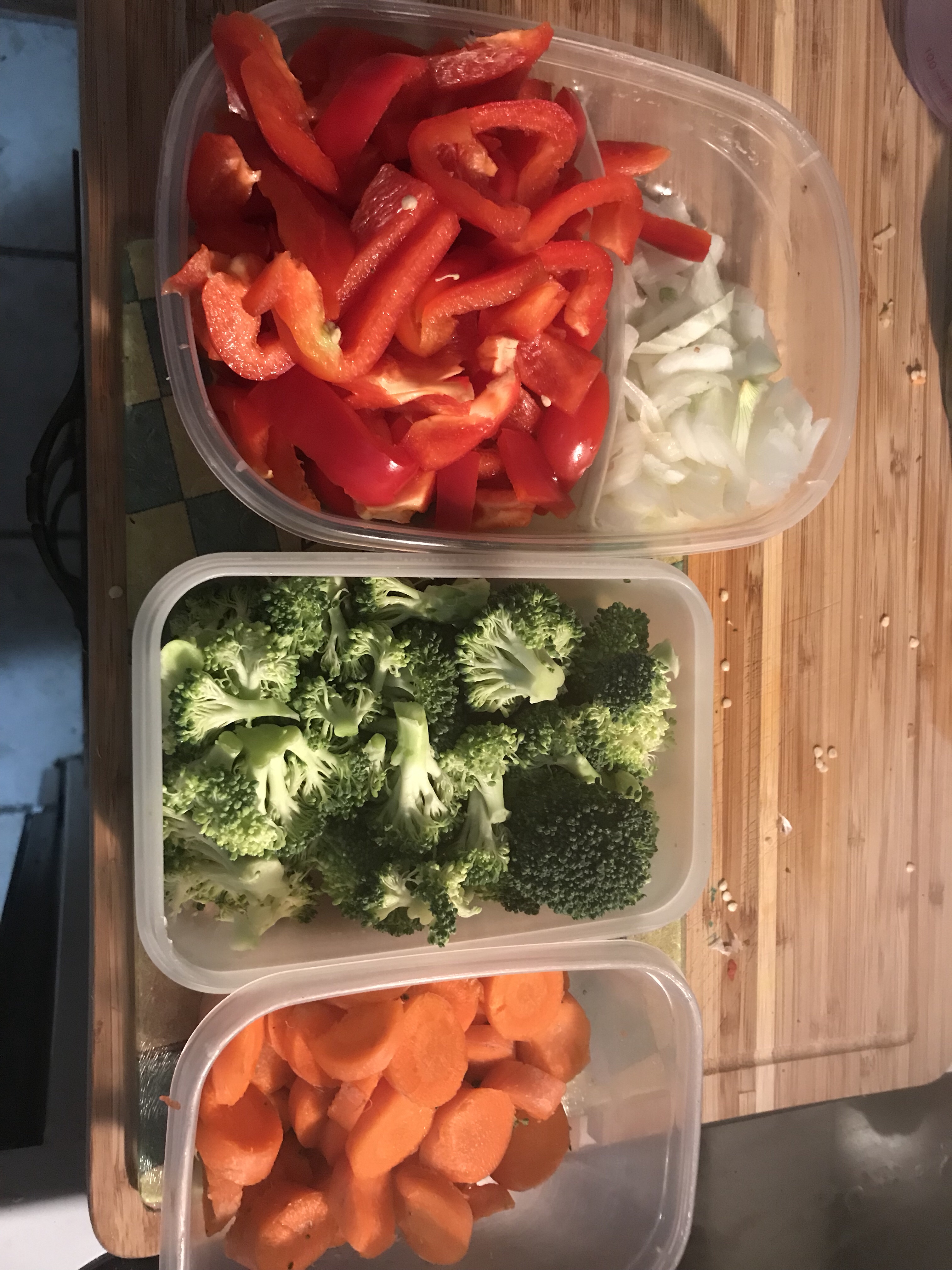 Cut veggies and separate. Chop onions, carrots, and red bell peppers into 1 inch strips. Chop broccoli into smaller pieces to make about 1 cups worth.