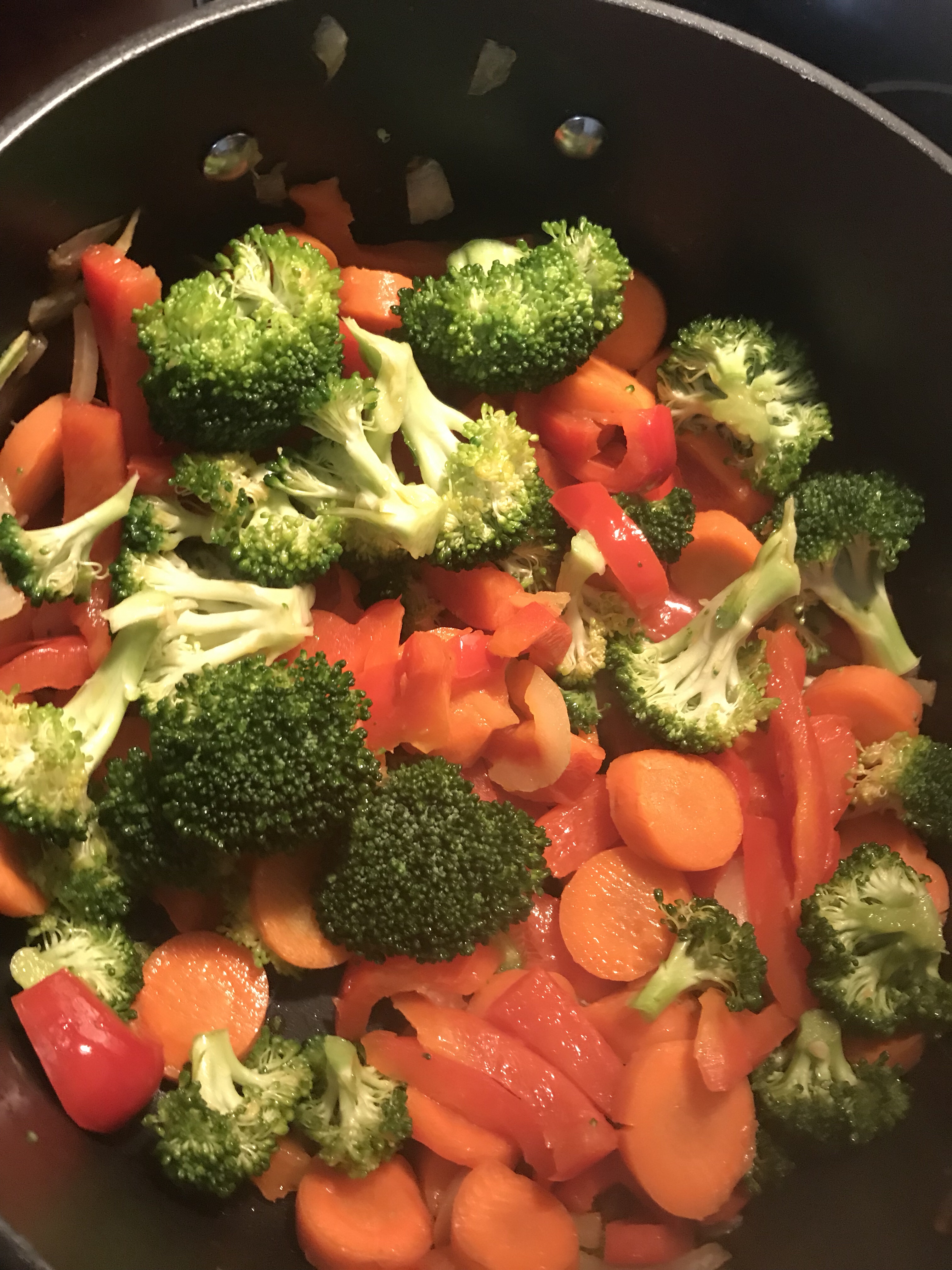 Heat the onions in a large pot on medium for about a minute with coconut oil. If you don’t have coconut oil just use vegetable oil. Next, add the chopped red bell peppers and carrots along with the broccoli. Make sure you don’t fry any of the vegetables you just want them to be a little soft (not crispy).