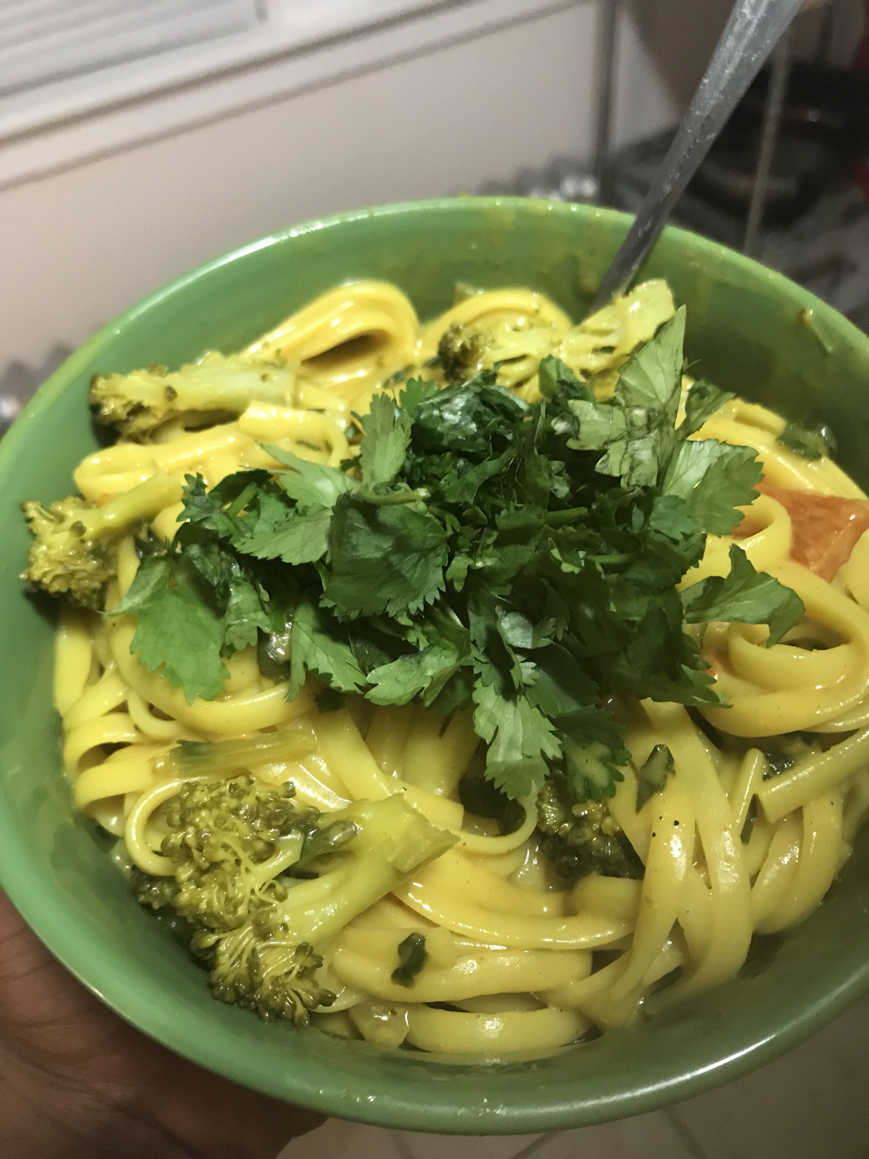 Allow the contents to simmer for about 5 minutes, then add chopped spinach and the cooked linguine from earlier. Once the spinach wilts in the mixture, turn the heat from medium to off and while still stirring, add chopped cilantro, Sriracha, and the juice of a lime.