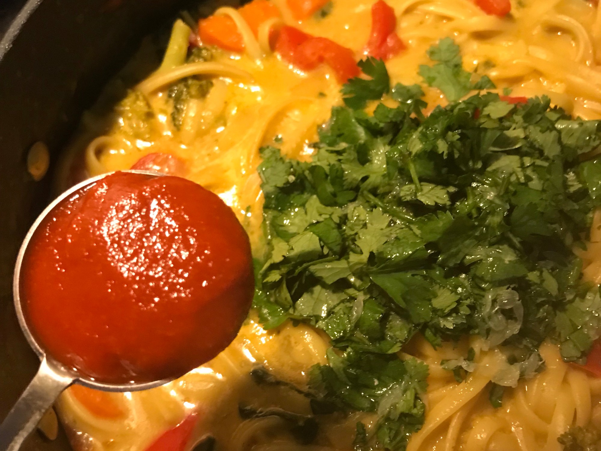 Allow the contents to simmer for about 5 minutes, then add chopped spinach and the cooked linguine from earlier. Once the spinach wilts in the mixture, turn the heat from medium to off and while still stirring, add chopped cilantro, Sriracha, and the juice of a lime.