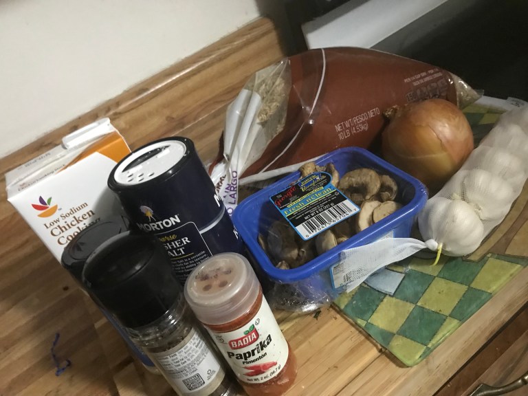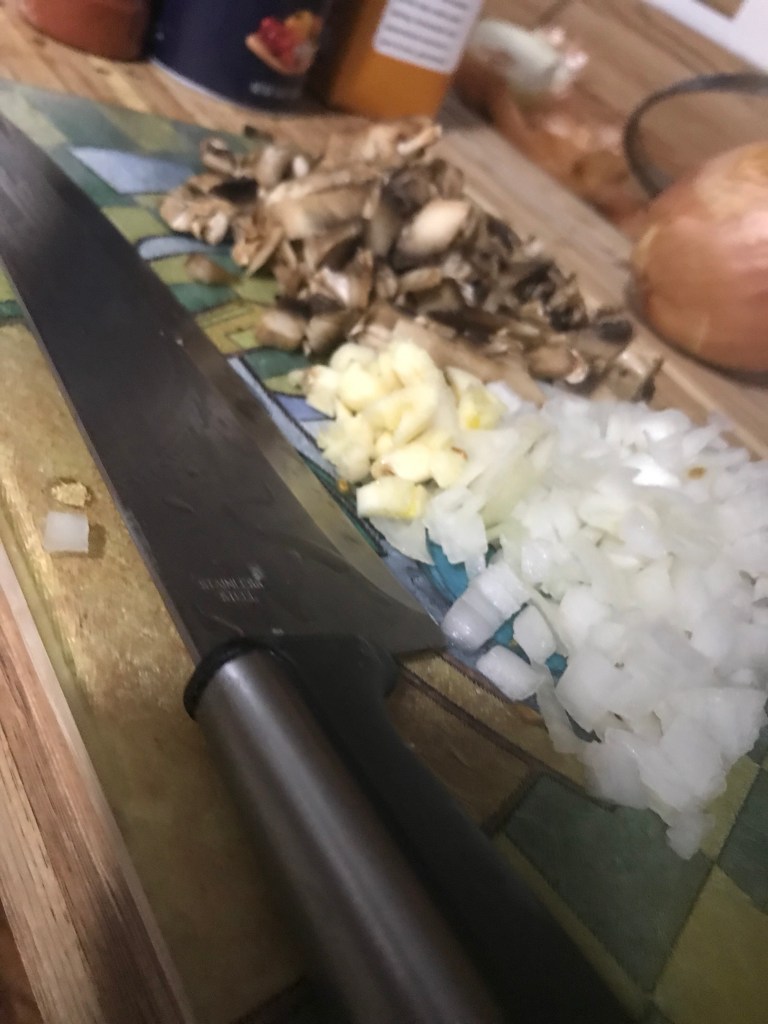 Dice half of a white onion, 1/2 cup of mushrooms, and 3 cloves of garlic.