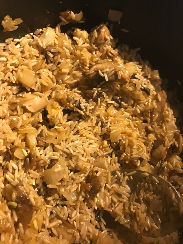 Fry the 3 ingredients in a medium pot with butter and stir on medium low heat. After a couple of minutes, pour in 1 cup of brown rice.