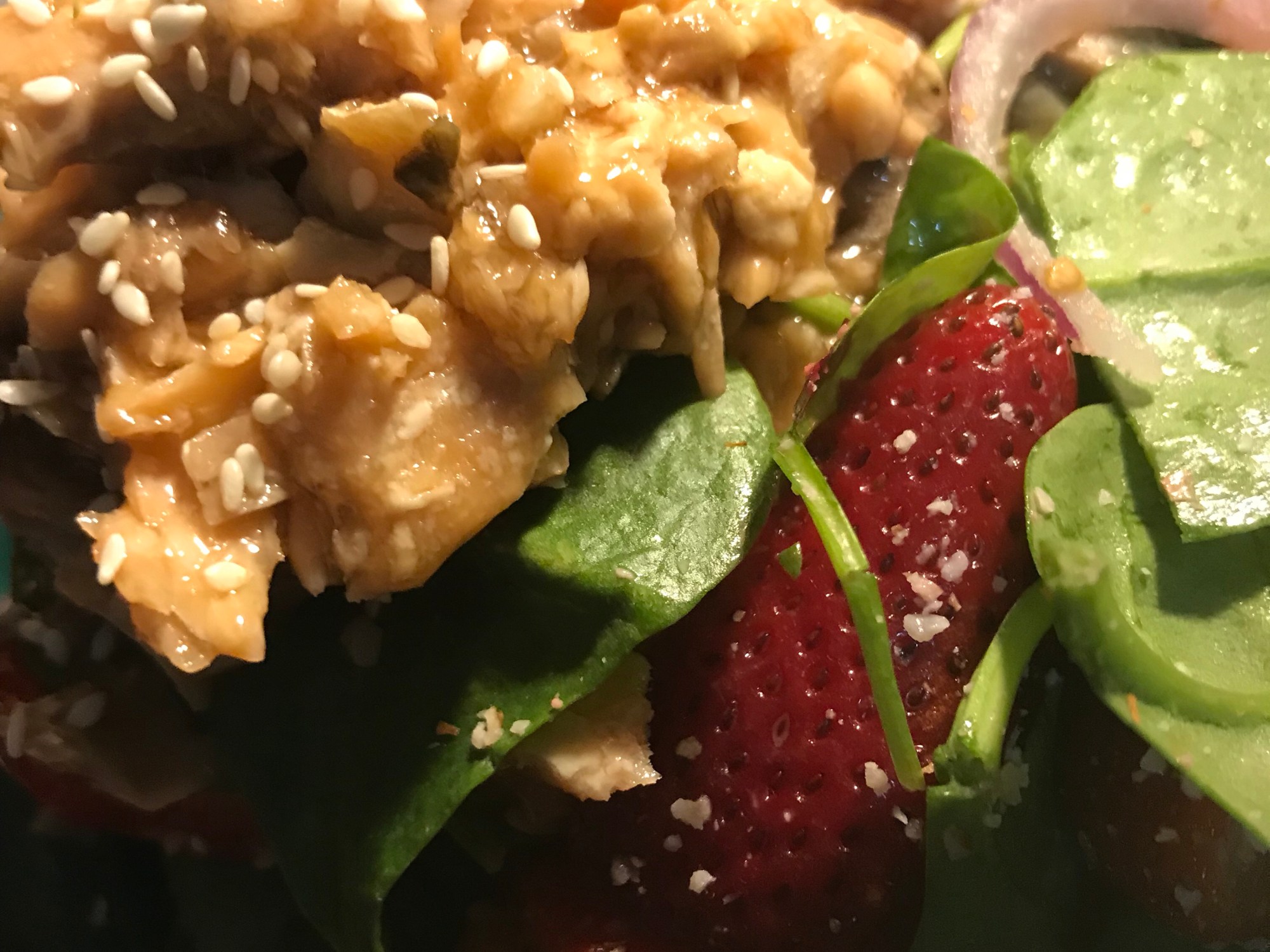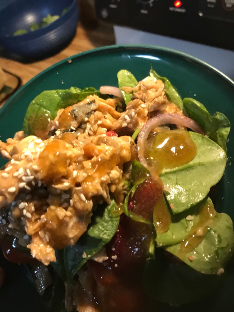 Plate the spinach salad and top with salmon and sesame seeds. Drizzle Teriyaki Sauce.