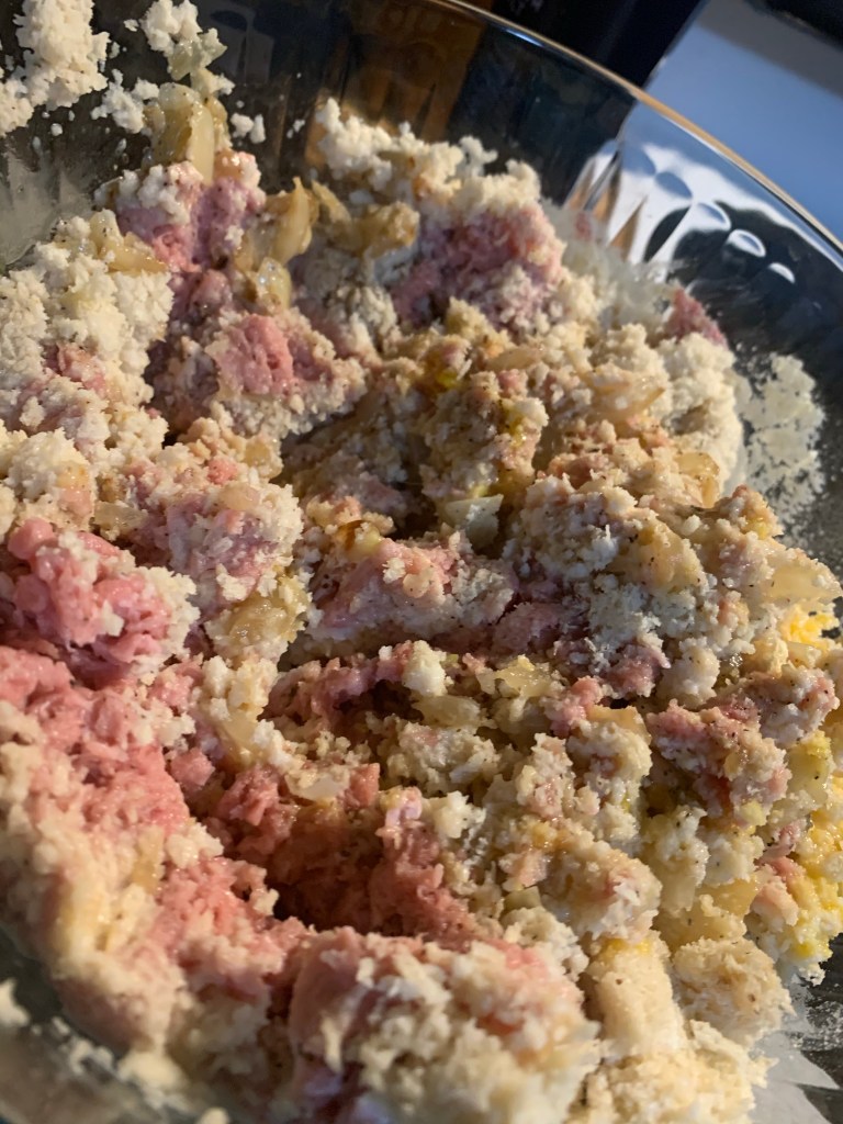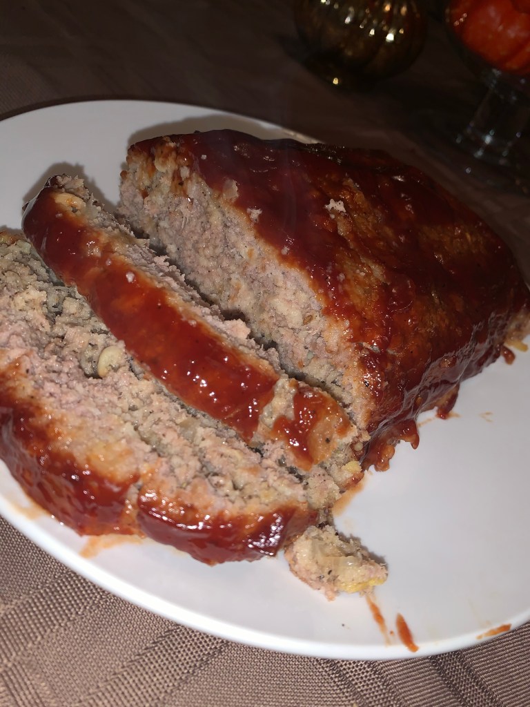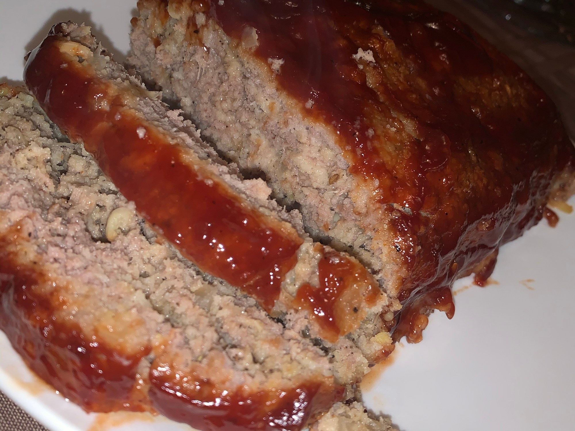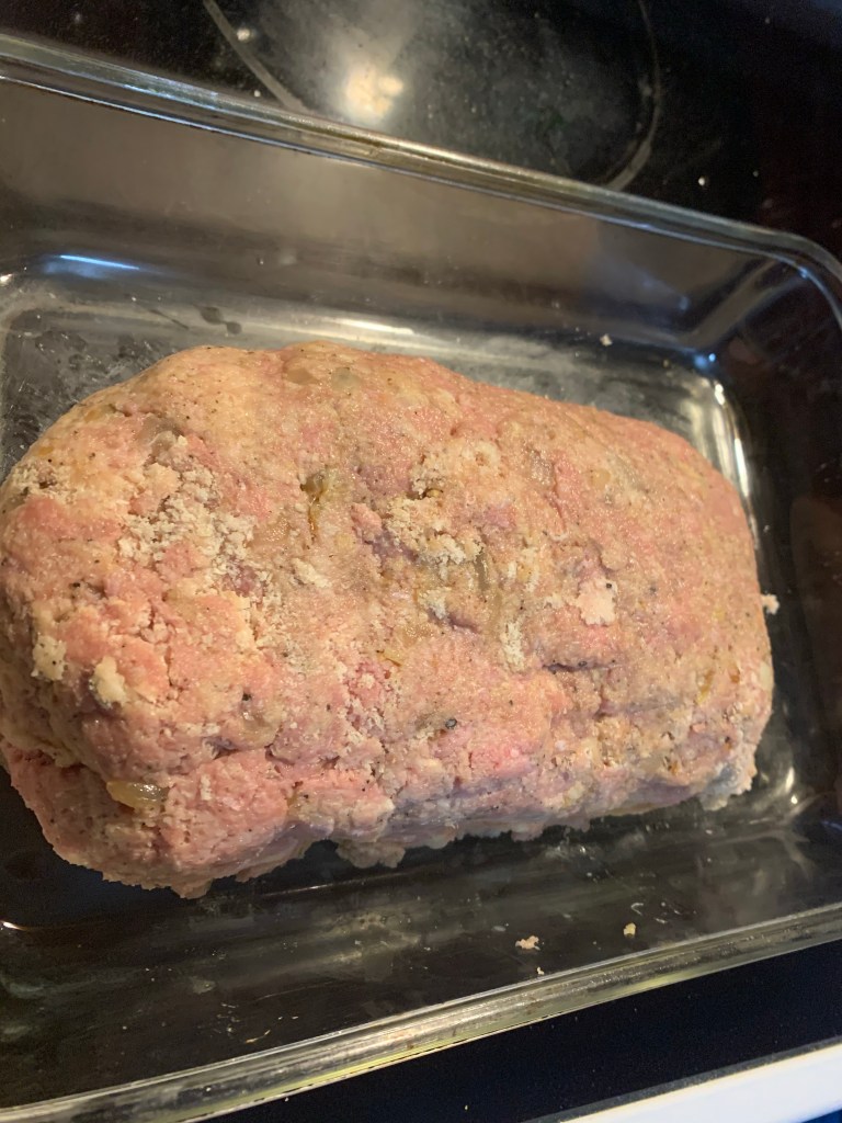 Next, move the ground turkey mixture from the bowl into a greased shallow baking pan and form the ground turkey mixture into a loaf with your hands. It should look similar to the picture below