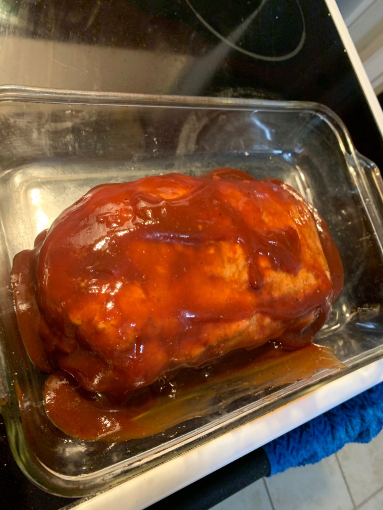 In a separate, smaller bowl mix ketchup, plain bbq sauce, a splash of Worcester sauce, black pepper and half a cup of brown sugar into a bowl. Spread over the surface of the ground turkey