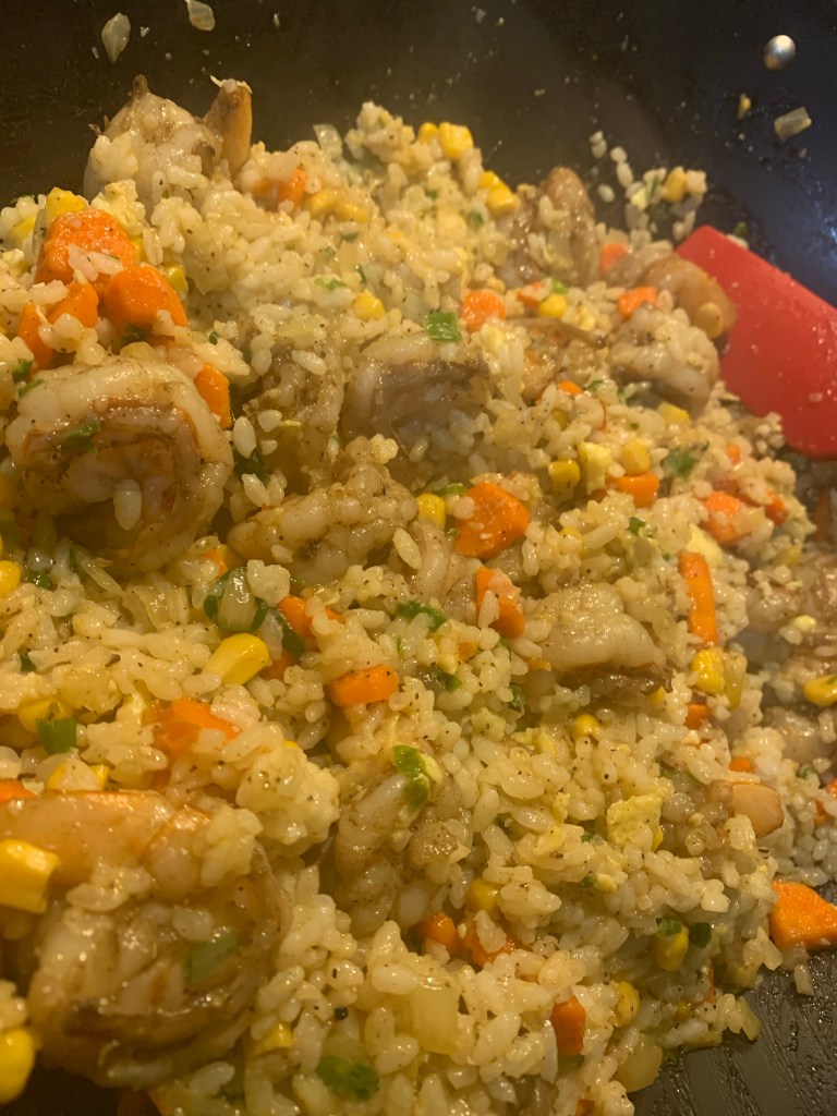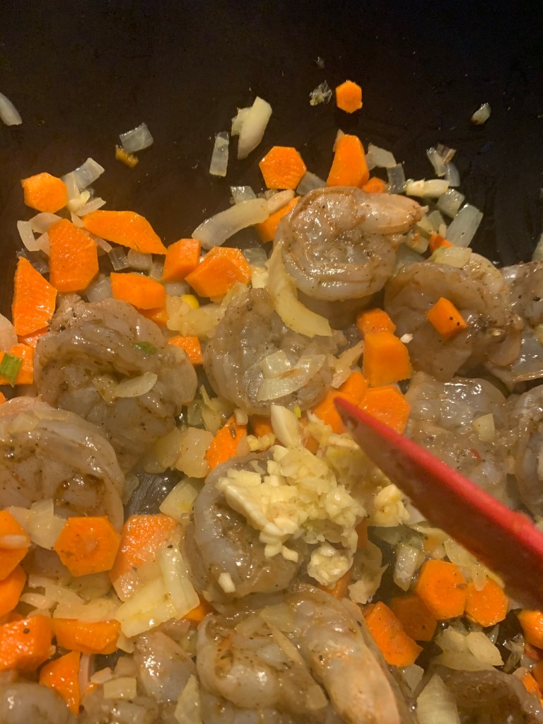 Turn heat to low-medium and add shrimp. Add corn, mix contents.
