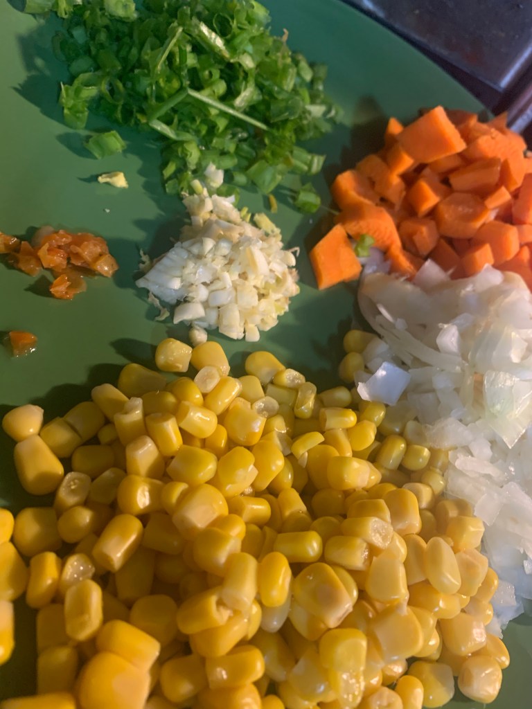 Dice carrots, garlic, slice scallions, about 3 tiny slices of scotch bonnet, white onions, pour out corn.