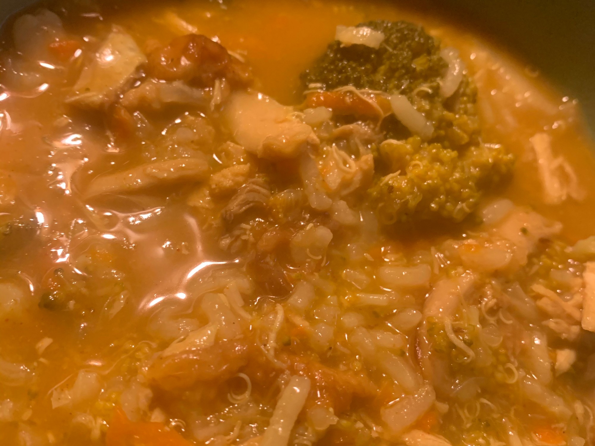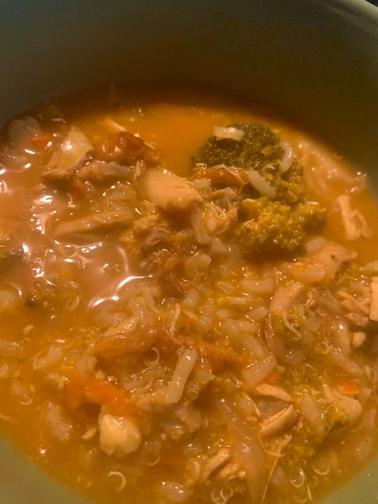 Add shredded rotisserie chicken, broccoli florets, and shredded carrot to the pot. Season with Tumeric and Paprika. Heat for another 2-3 minutes