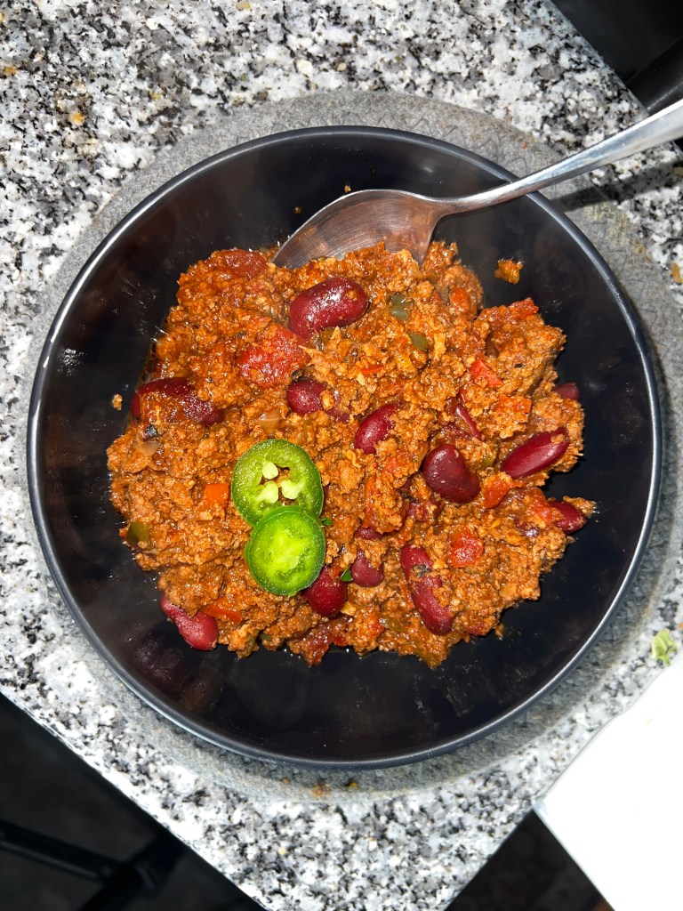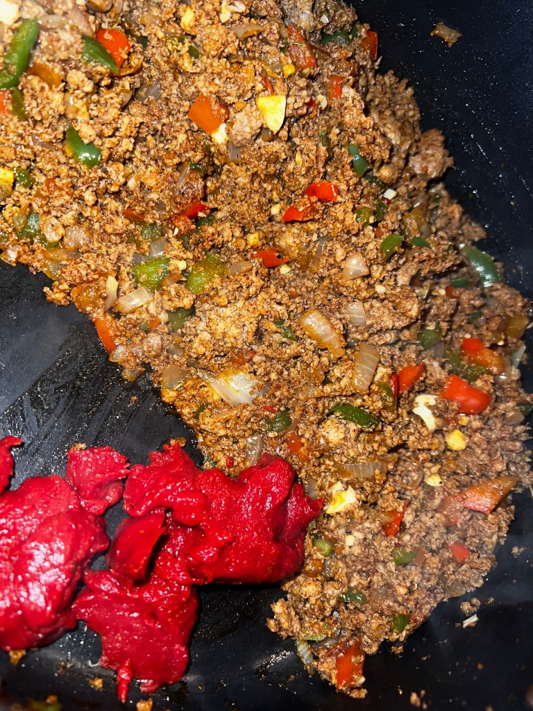 Make a well for the tomato paste and cook it down for a minute or so before mixing it with everything else. Add the can of diced tomatoes followed by the can of kidney beans, 1 can of IPA beer and 2 cups of chicken stock.