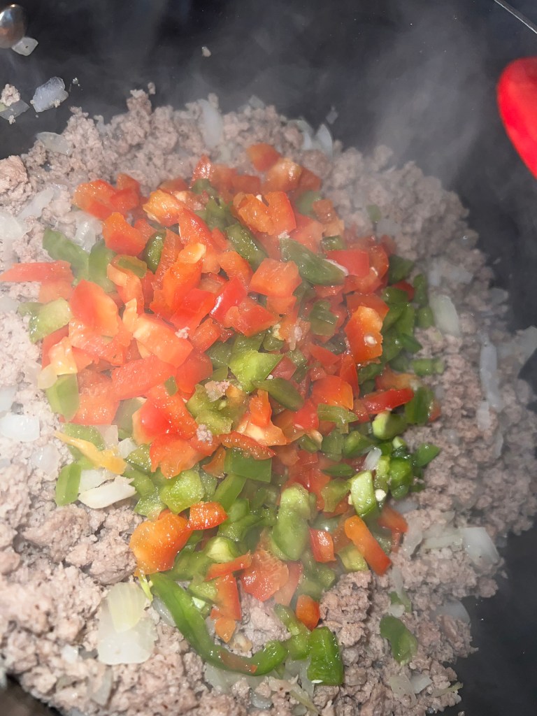Take the ground turkey, and cook it down with 1 tbsp of olive oil, seasoning with salt and pepper. Then add in the diced vegetables (onion, bell peppers, jalapeños – hold off on the garlic) in a pot. Cook all the vegetables down for a couples of minutes.