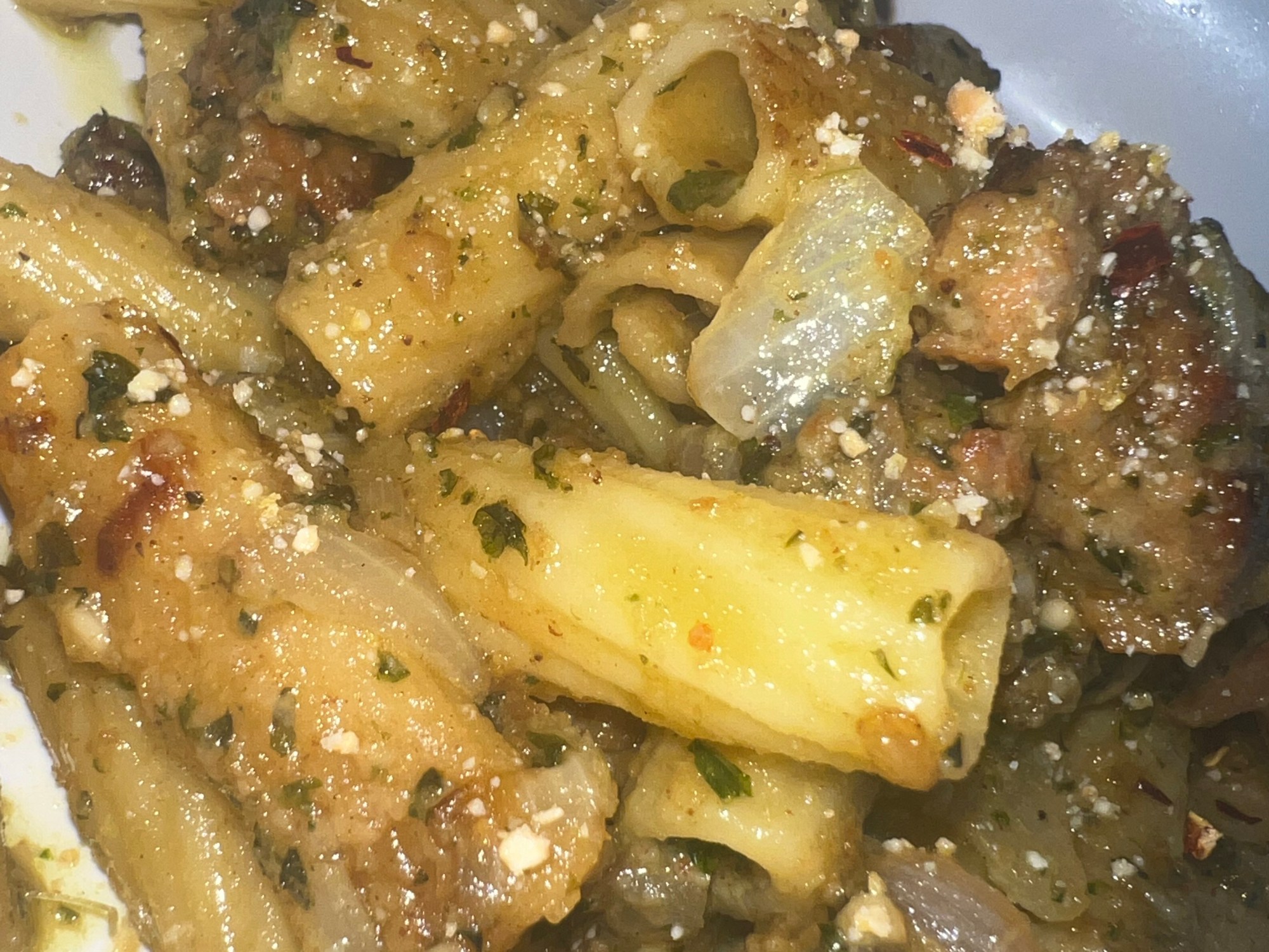 Combine all the ingredients in the frying pan, then pour the reserved pasta water in.