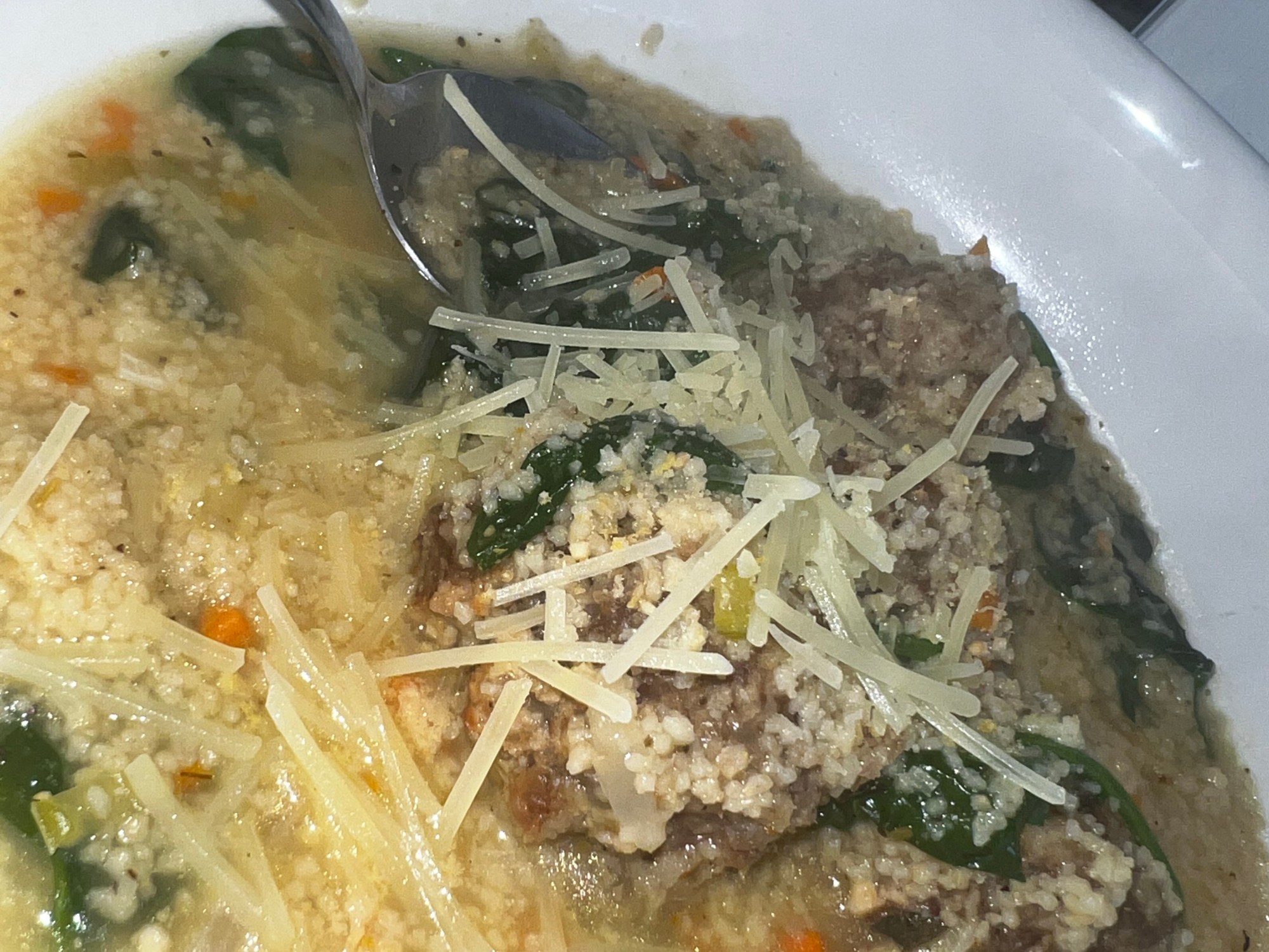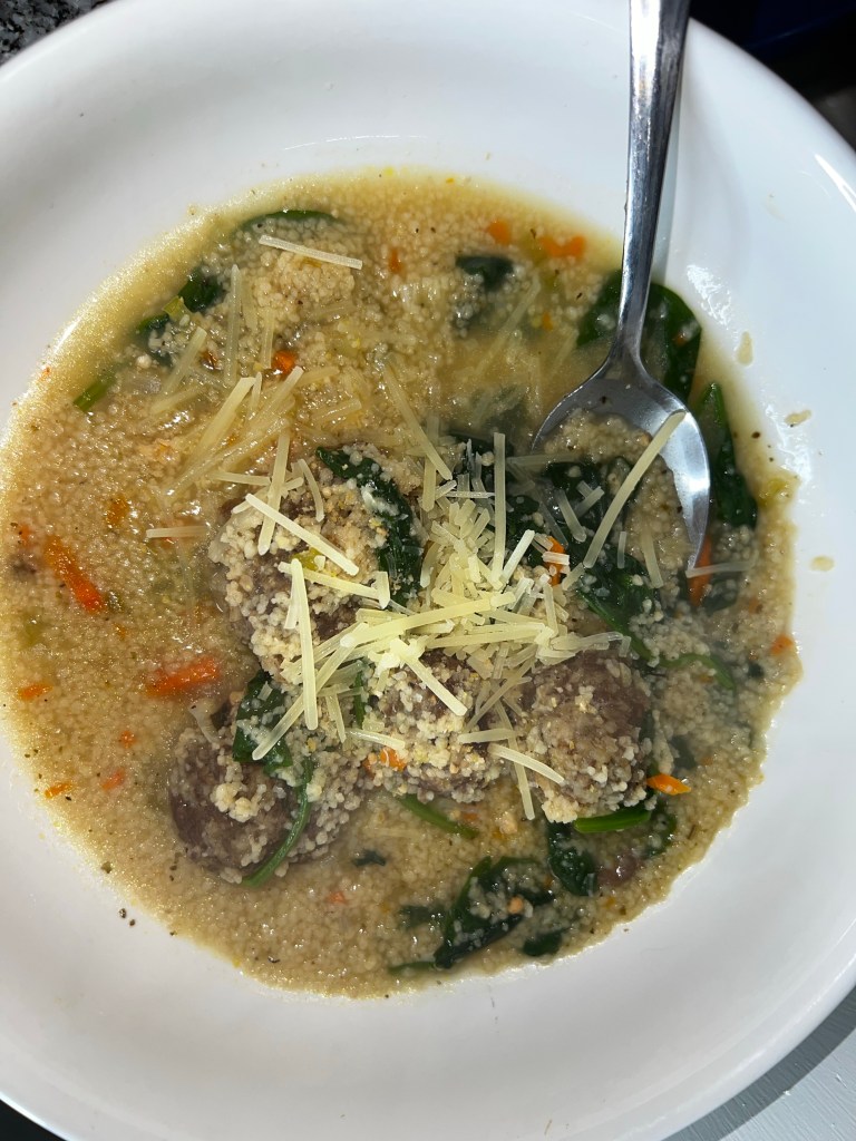 - After around 5-6 minutes pour in chicken broth along with 1/4 cup of white wine. Add 1/2 cup of cous cous and meatballs. Cover and allow to simmer for for 5 minutes.