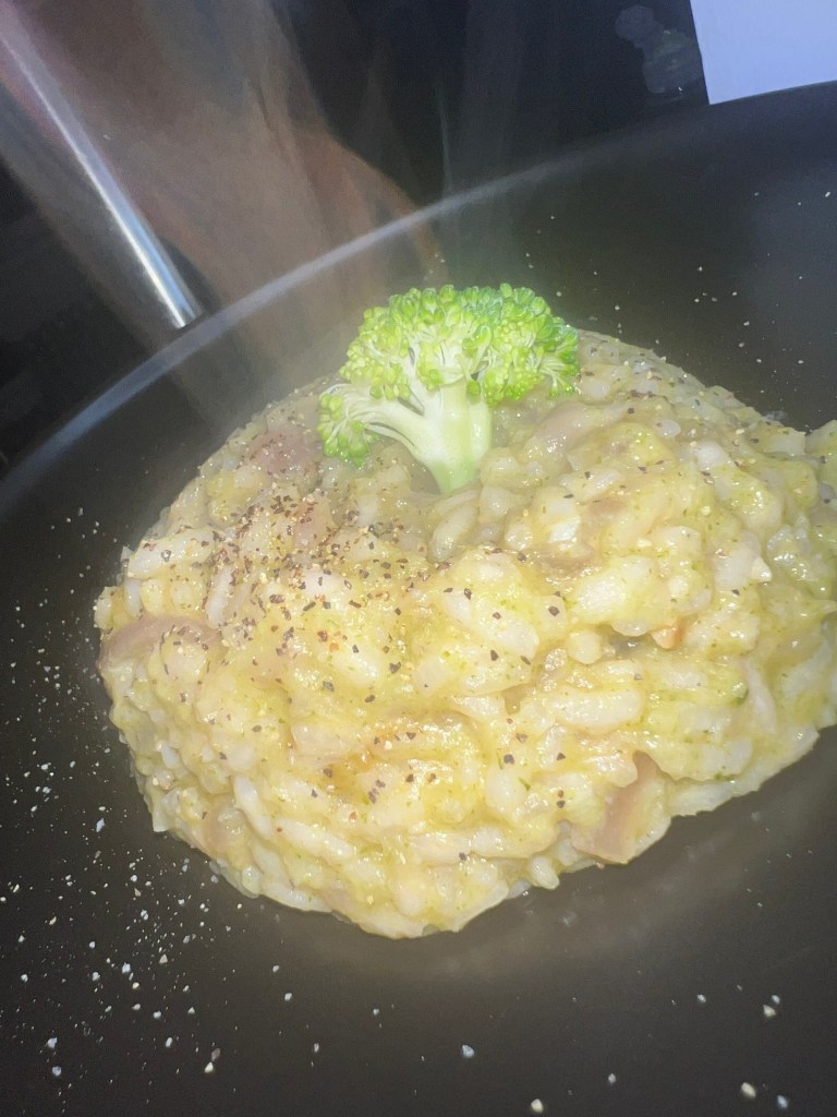 - Using a small rice bowl form the rice onto a dish, top with a small chopped broccoli floret and season lightly with salt and black pepper.