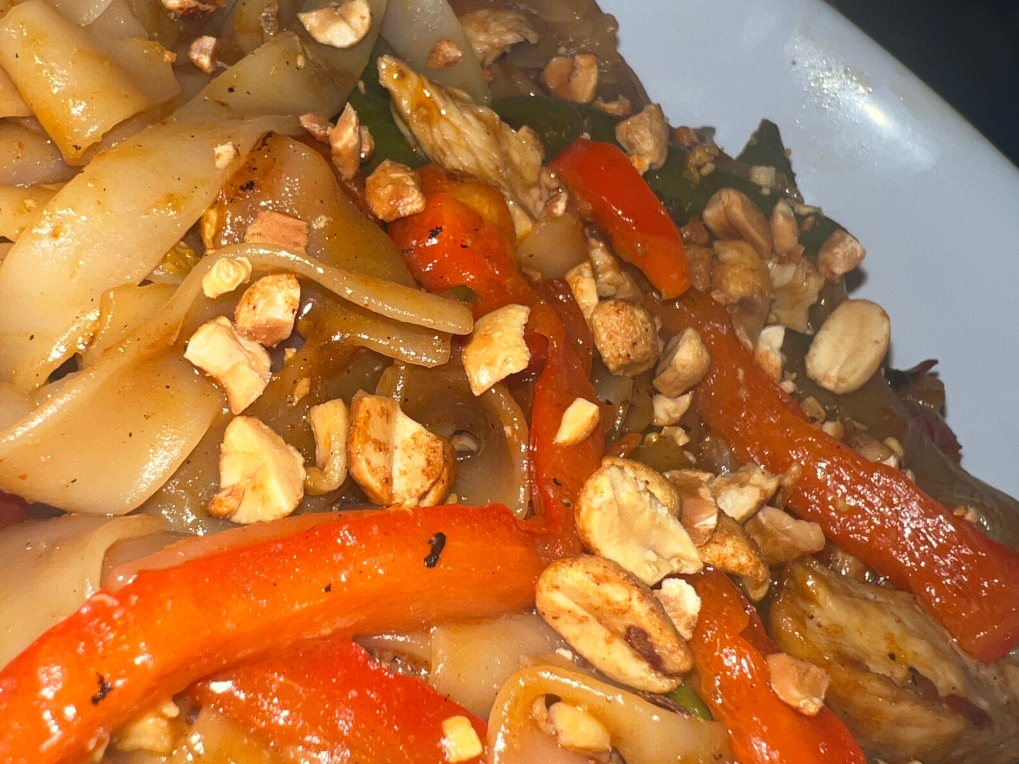 - Drain and add the rice noodles to the wok/frying pan, stir around for a minute, turn the heat to medium then pour in the sauce.